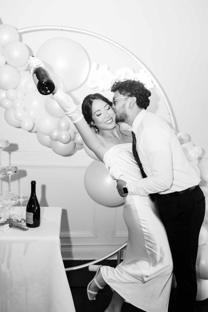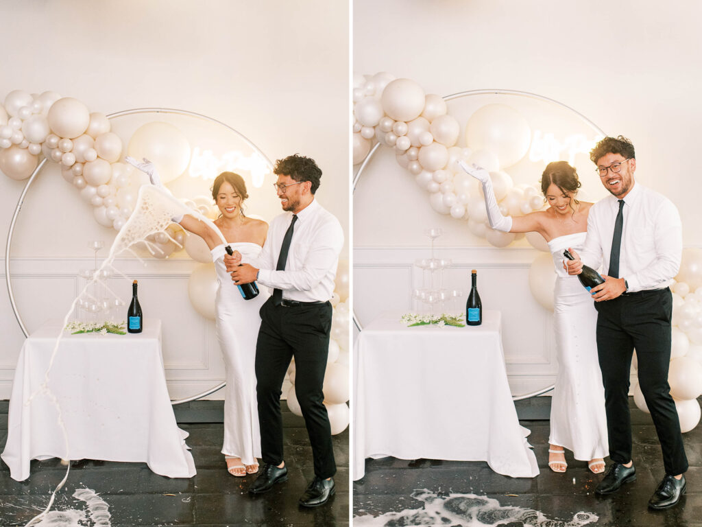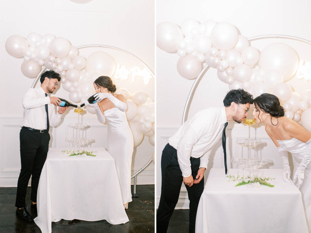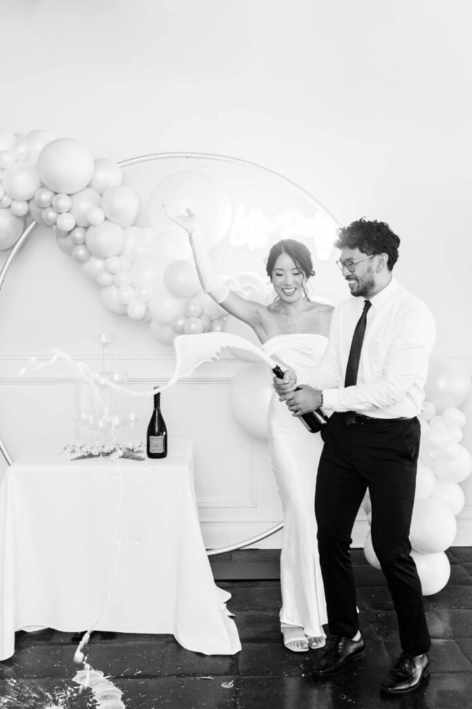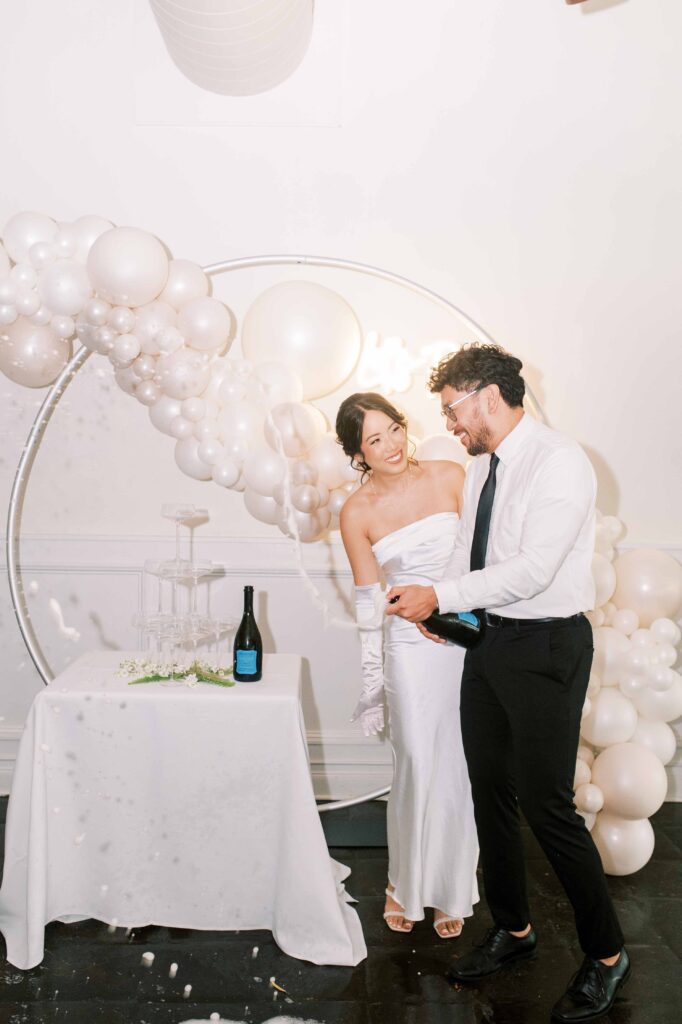 As their photographer and partial planner for the day, I had a front-row seat to Ada and Jeremey’s story. (Shout out to the owner’s talented daughter who handled most of the design details! She did fabulous work!) I chose direct flash photography to capture the bold champagne pop and sparkling champagne tower moments, while opting for film for the rest of the day. These photography choices enhanced their elegant aesthetic, bringing out their elopement’s sophisticated yet spontaneous essence.