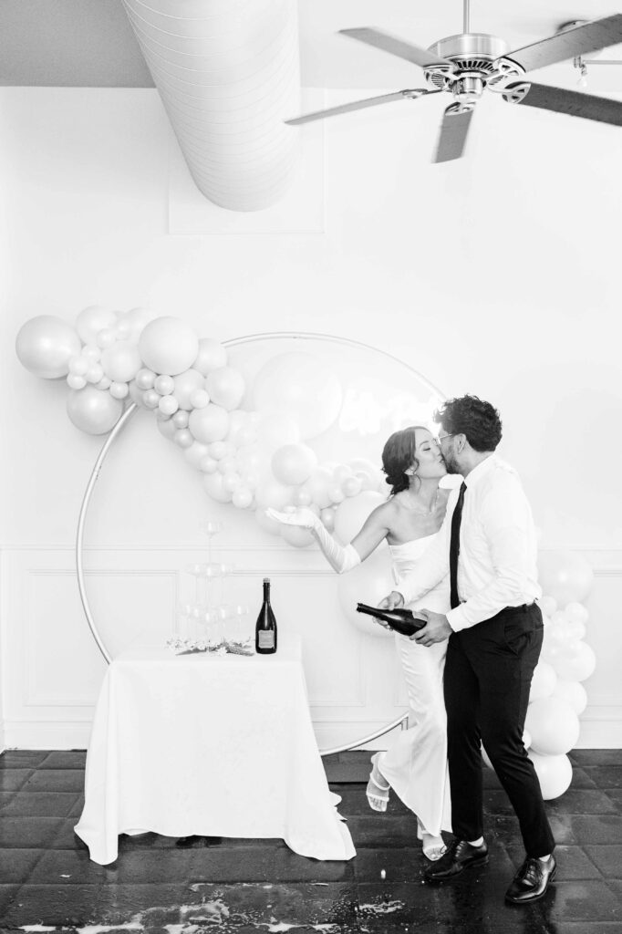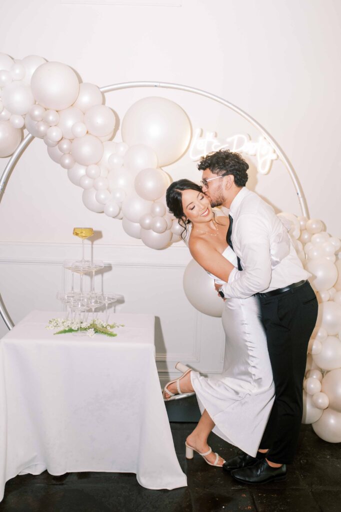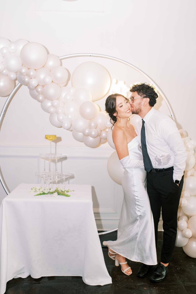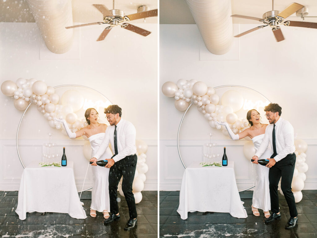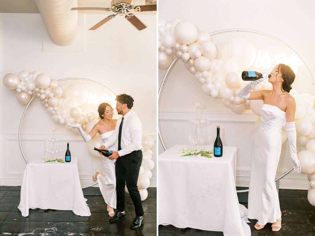 As their photographer and partial planner for the day, I had a front-row seat to Ada and Jeremey’s story. (Shout out to the owner’s talented daughter who handled most of the design details! She did fabulous work!) I chose direct flash photography to capture the bold champagne pop and sparkling champagne tower moments, while opting for film for the rest of the day. These photography choices enhanced their elegant aesthetic, bringing out their elopement’s sophisticated yet spontaneous essence.