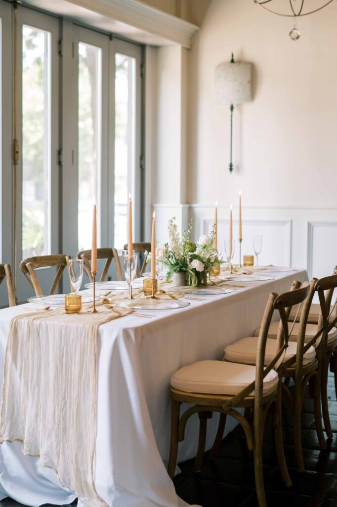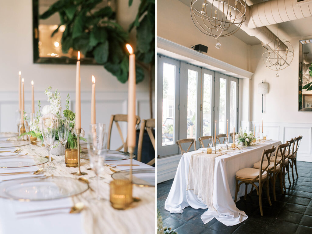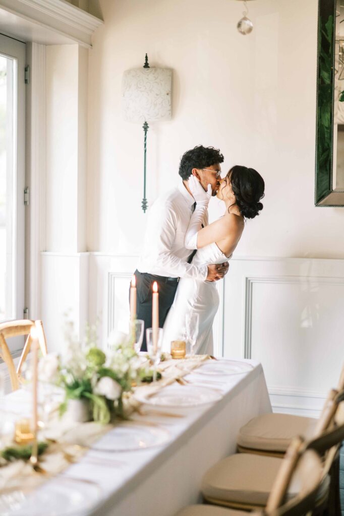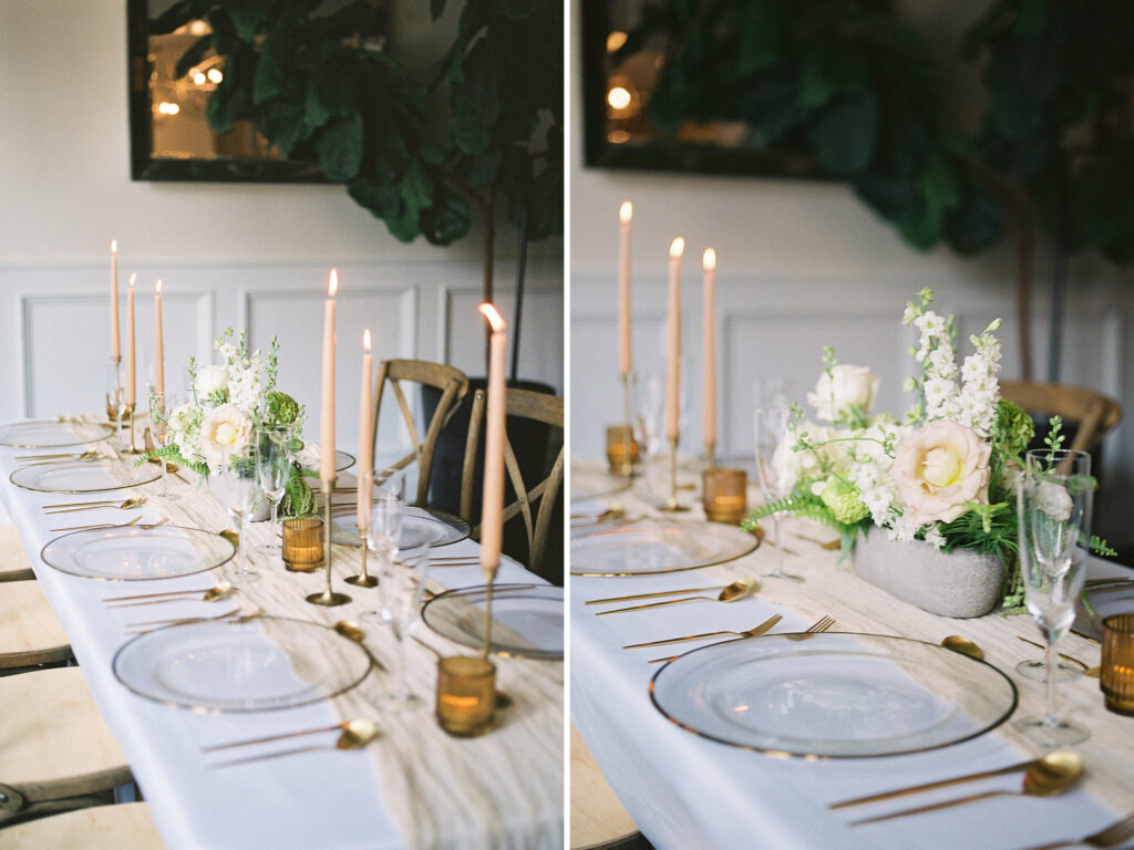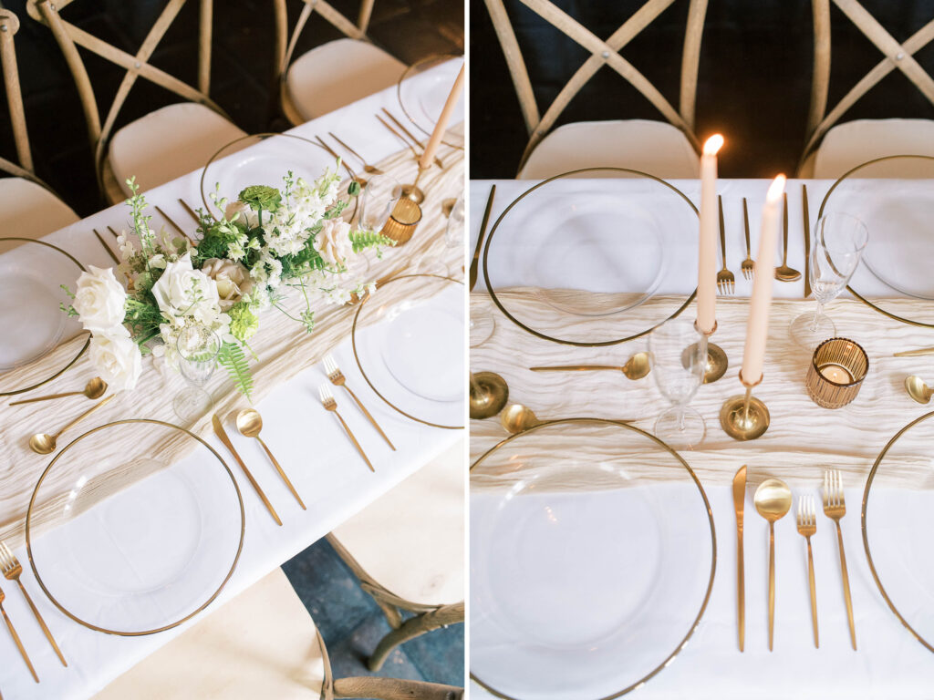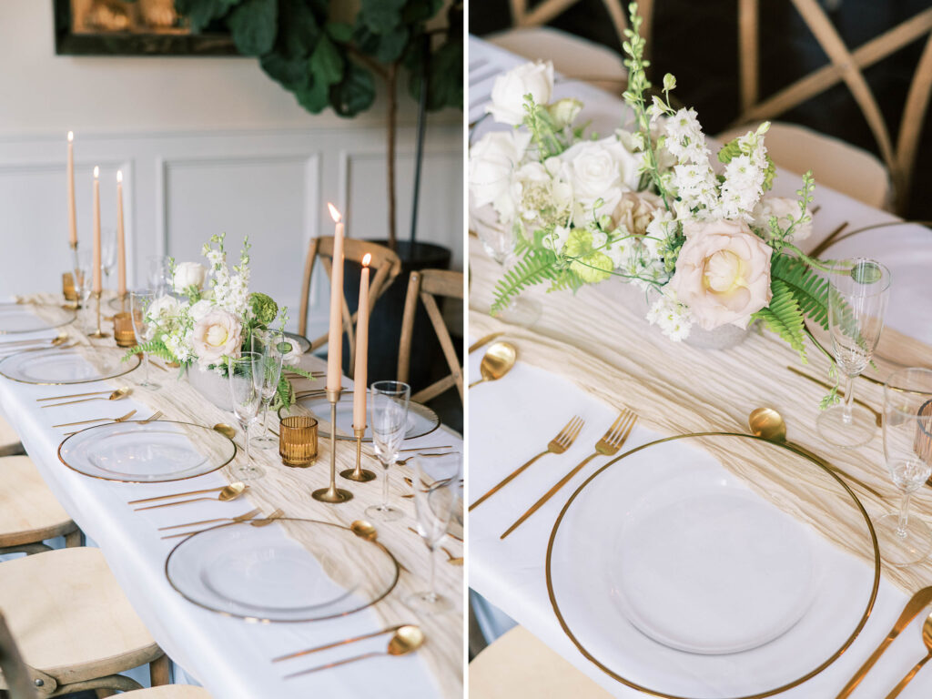Stick to a minimal, consistent color palette. Too many colors or busy setups can distract from the intimacy of an elopement. Ada and Jeremey’s white and gold tablescape made their space feel cohesive, effortless, and polished.