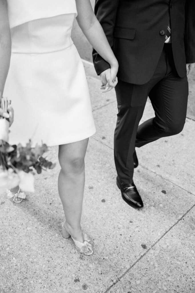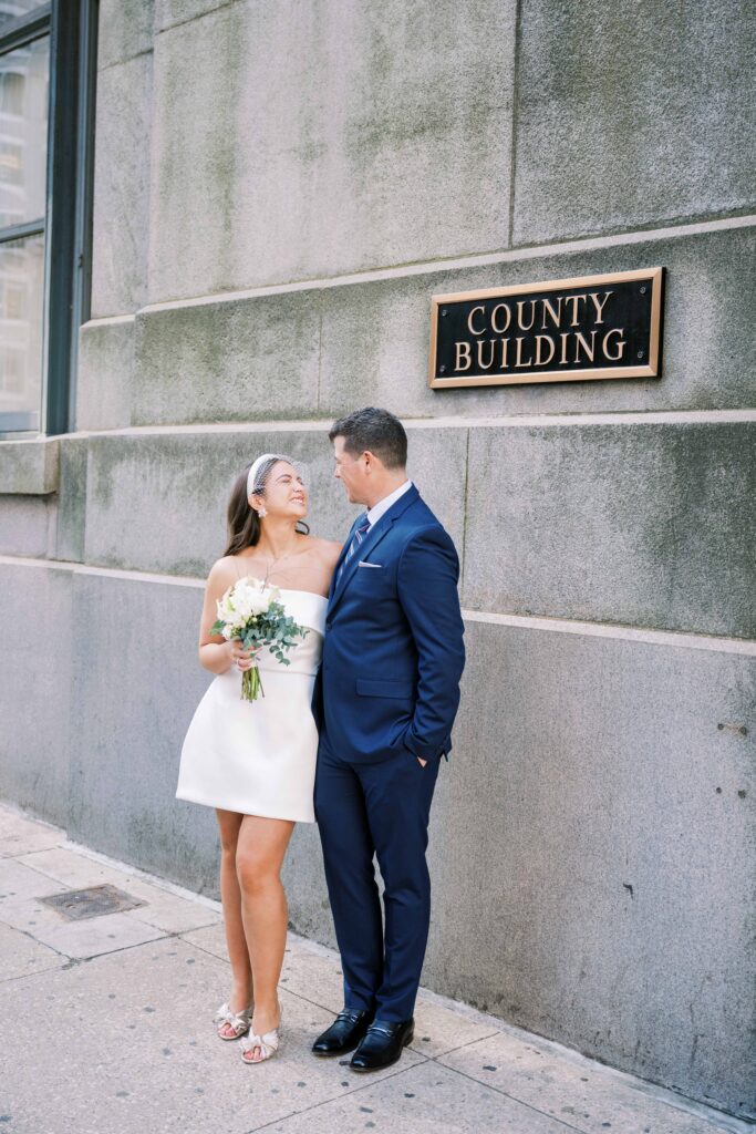 But first, we need a moment for their flawless style. One of the things I loved most about their day was how effortlessly chic it felt. Megan wore a structured white A-line mini dress paired with a birdcage veil. Modern, timeless, and perfect for an elopement. Ross kept things classic and polished in a navy suit, complementing the overall look without going too formal. Together, they struck that ideal balance that works so well for city elopements.