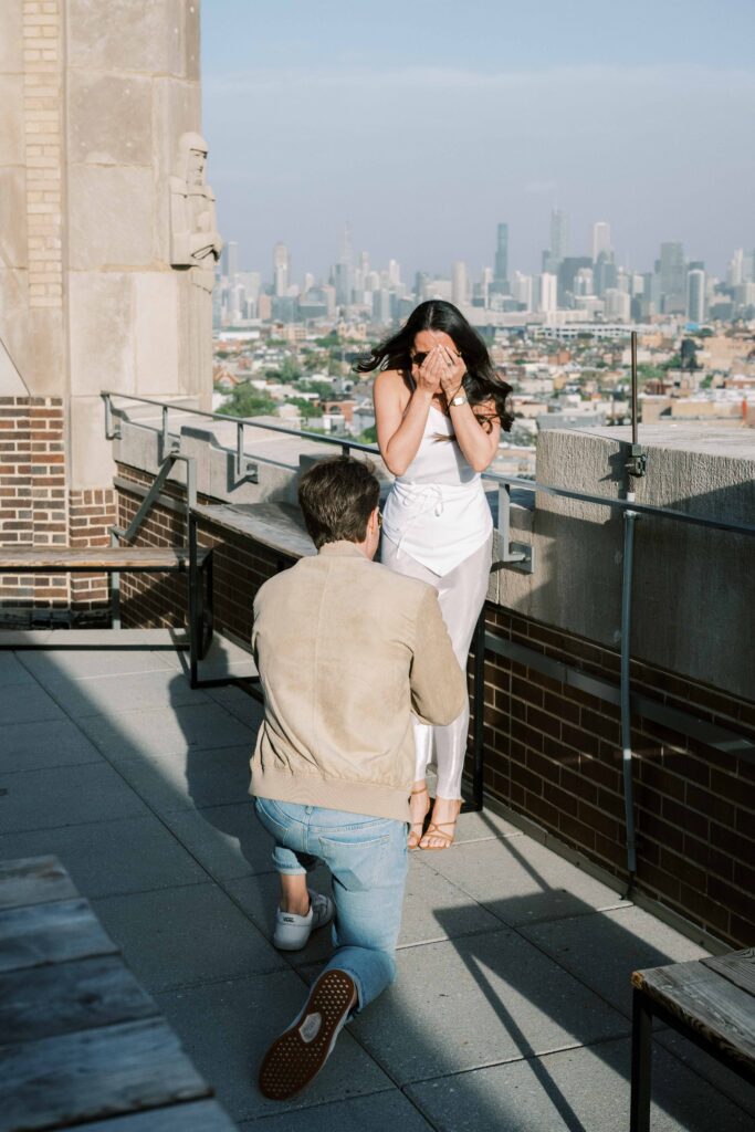 The best surprise proposals are those where the other person is completely unaware. Caitlin had no idea what was coming because TJ said they were headed to a party at The Robey. Since they were already dressed up, it felt natural. Arriving early to a quiet rooftop, Caitlin simply assumed they were the first ones there. (And, in a way, all of that was true. She just didn’t know it was their party!)