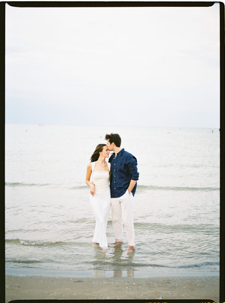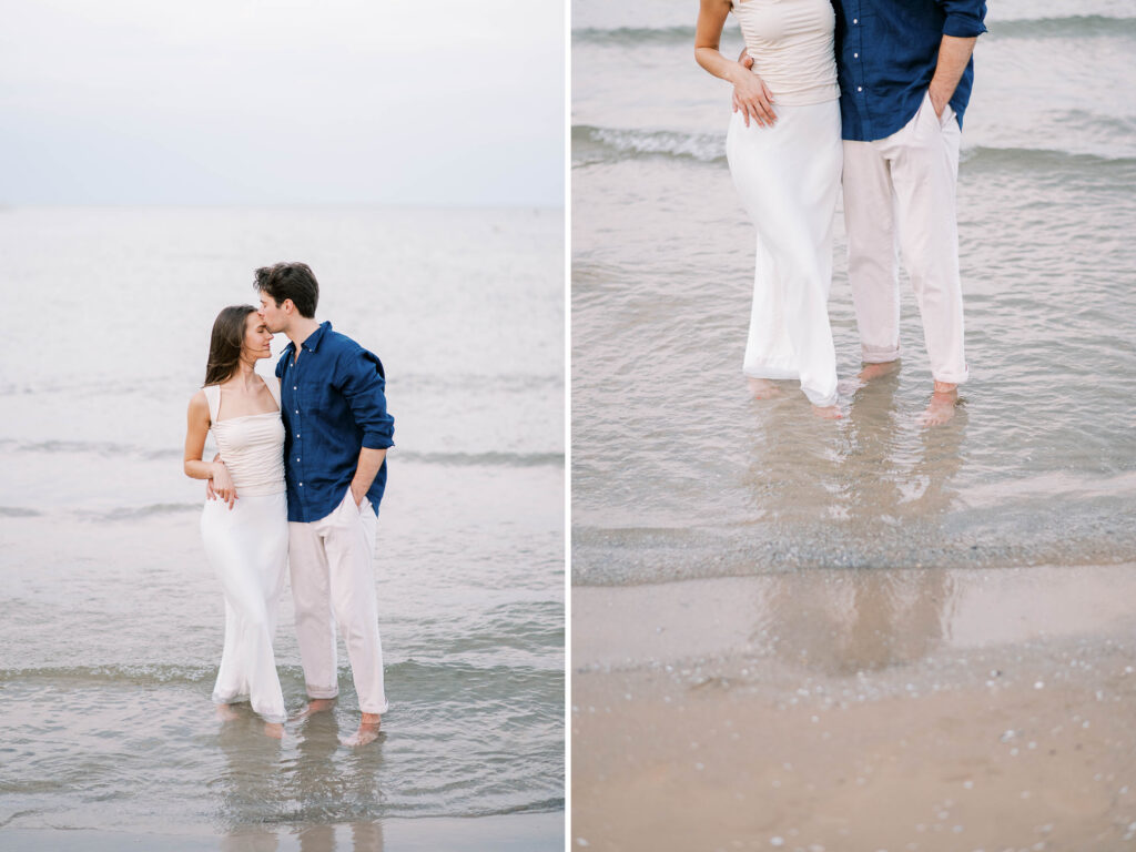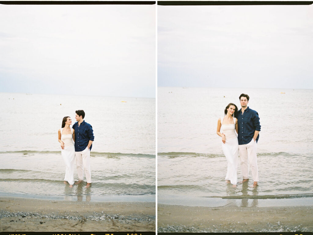 Ava changed into a flowing cream-colored dress that moved beautifully in the breeze, while Sam switched into khakis paired with a classic blue button-down. The lighter tones immediately softened the overall look, blending perfectly with the natural landscape and gentle lake light.