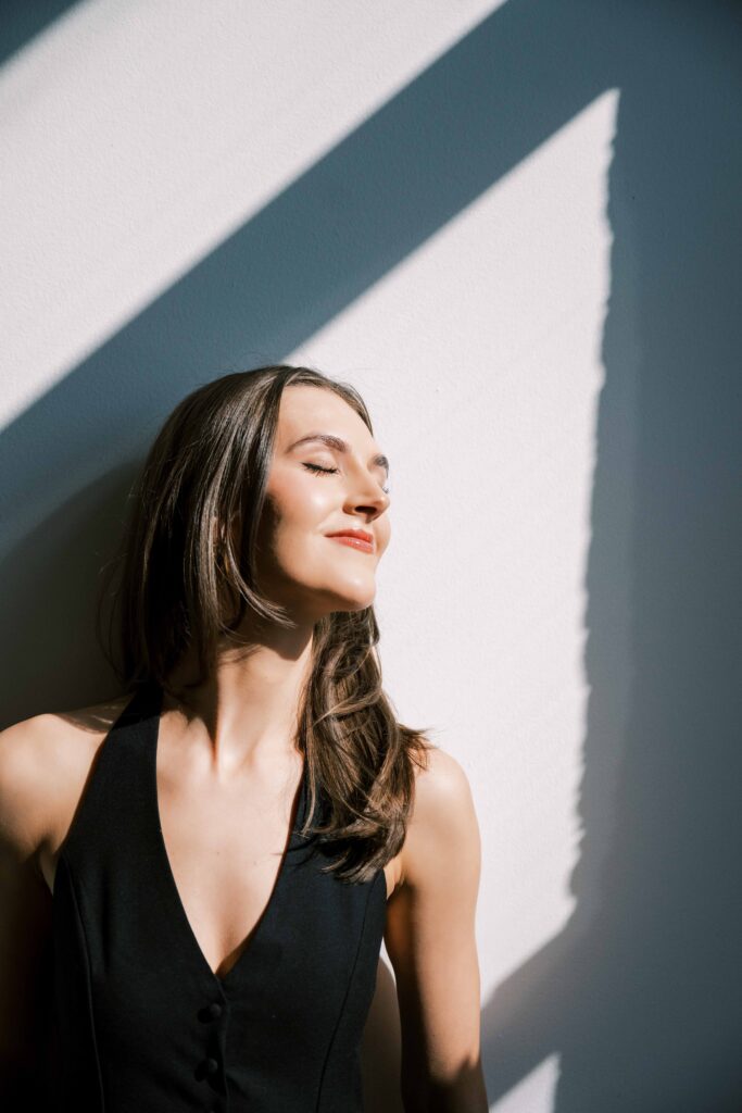 We began the session in a bright, minimalist studio in Chicago. The space featured clean white walls, striking black architectural lines, and beautiful natural light. This clean, minimalist setting is ideal for the modern, editorial look Ava envisioned.