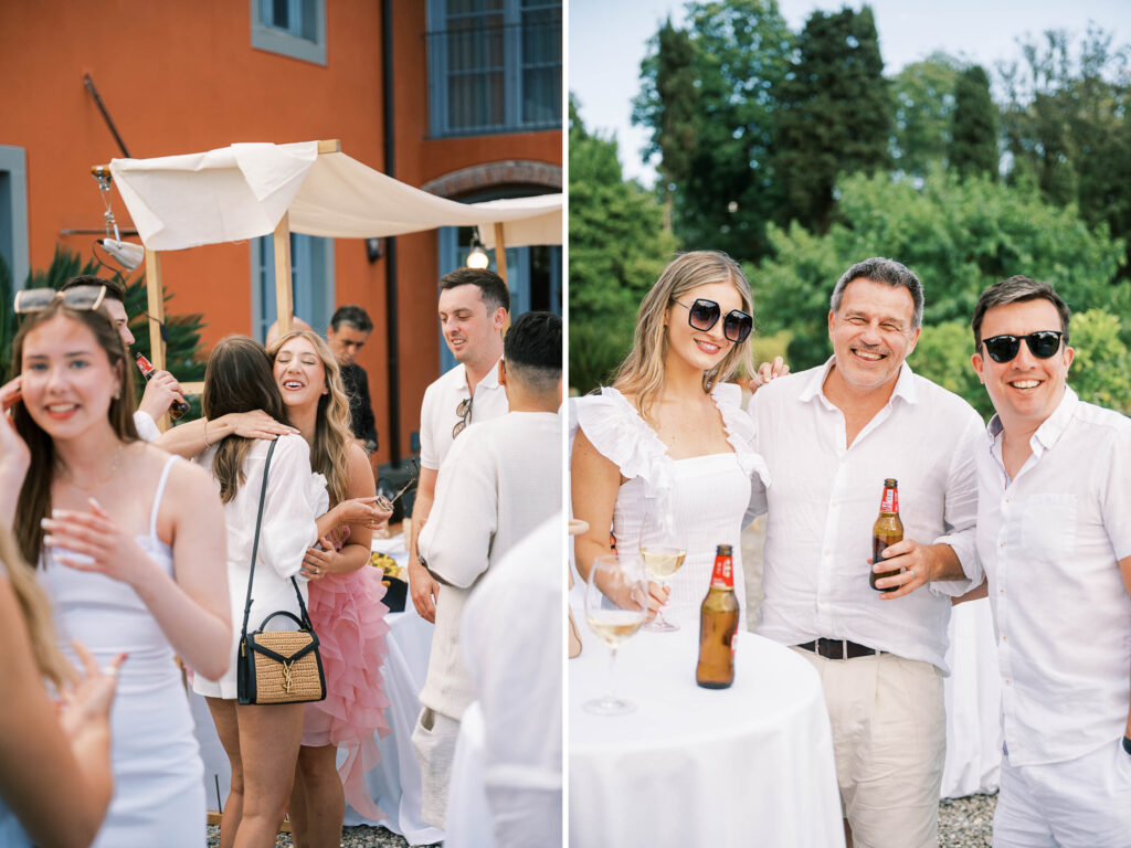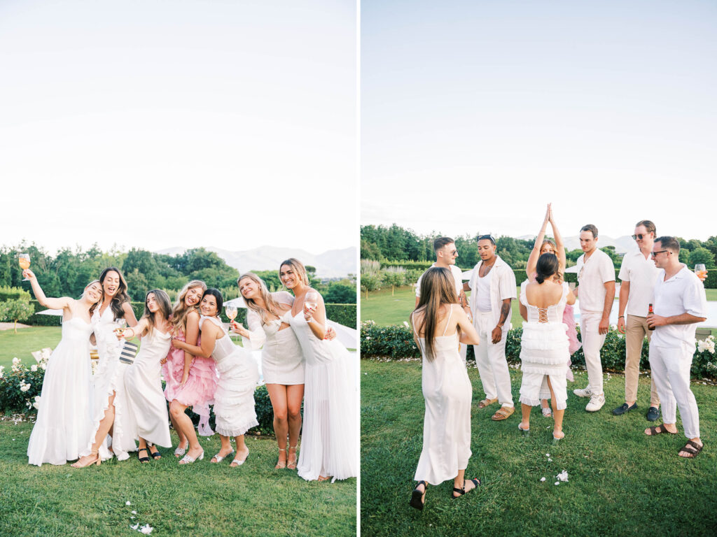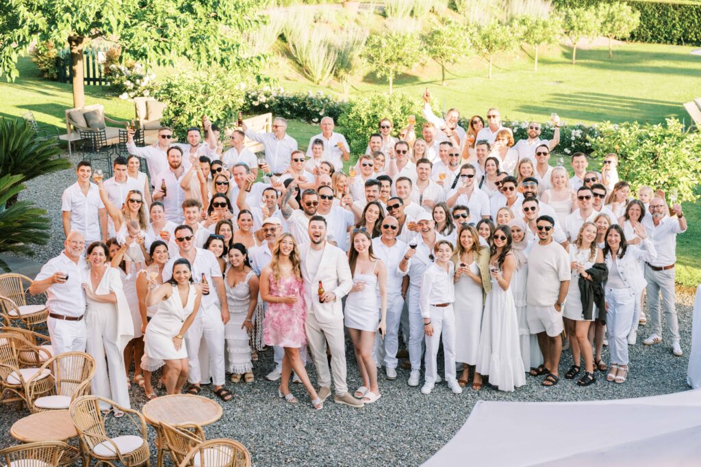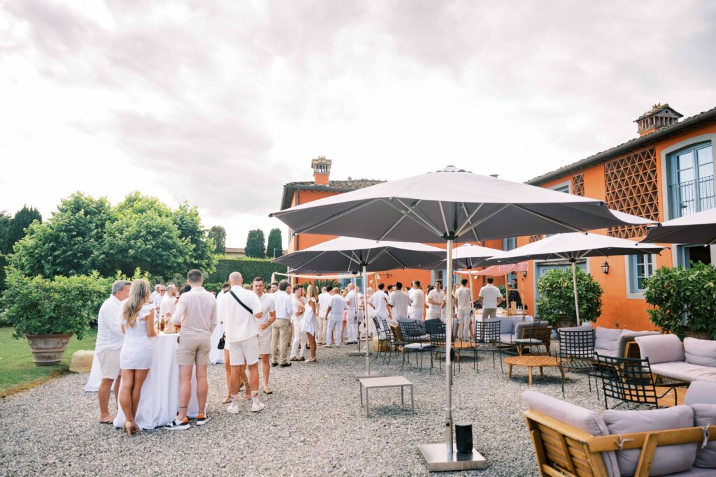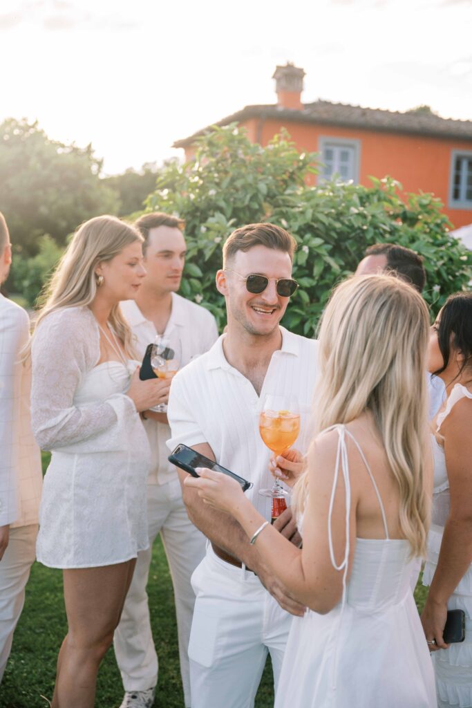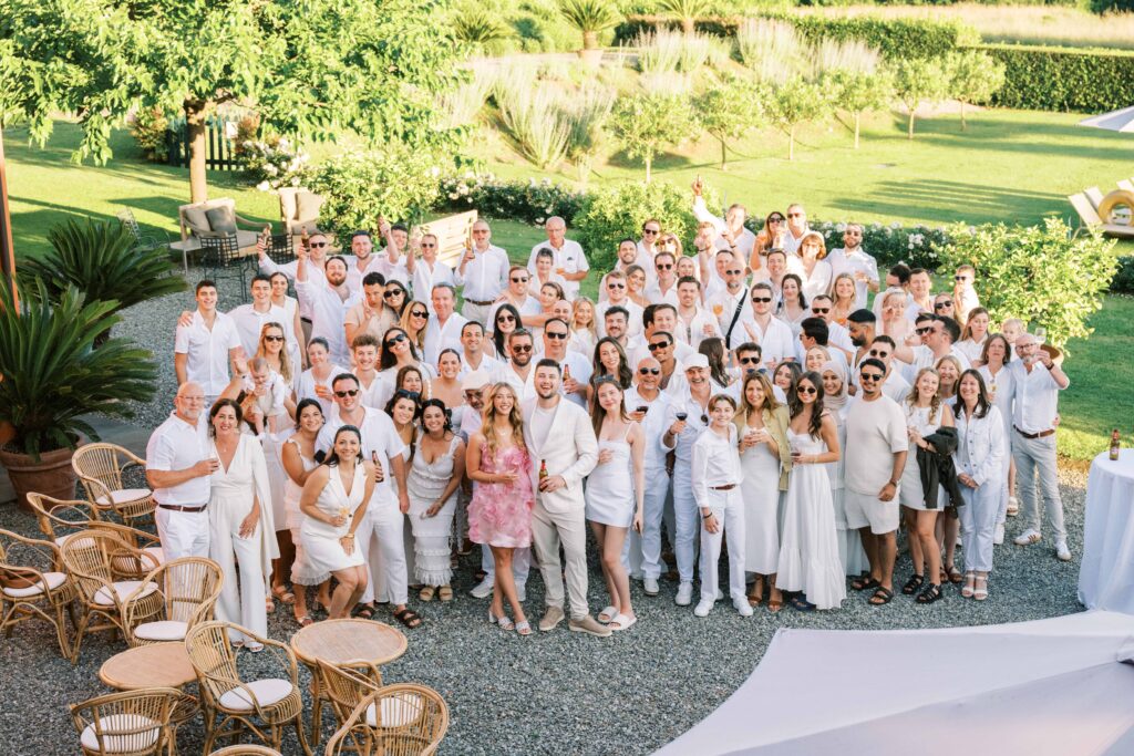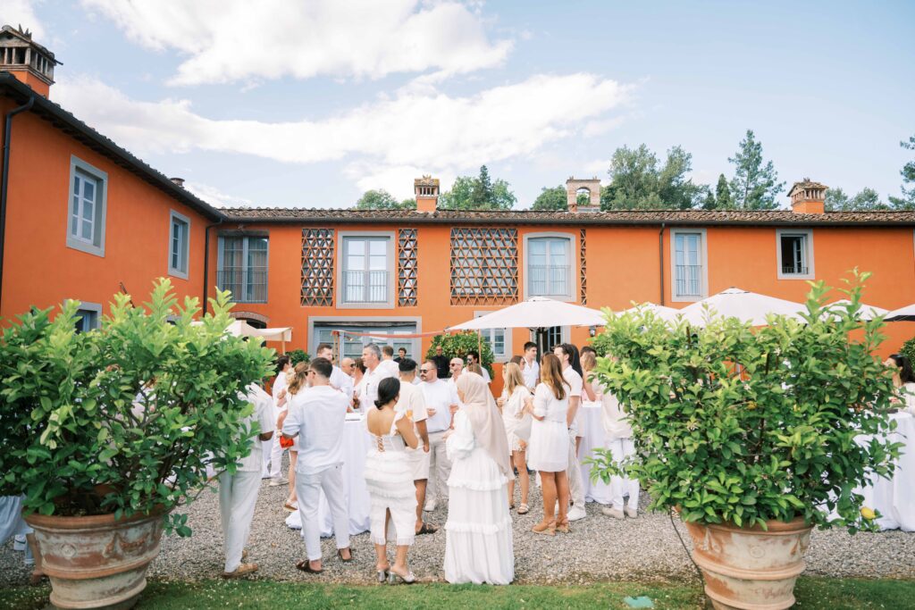 Maria and Josh’s welcome party was the perfect opening scene. Set against the dreamy backdrop of Lucca in the Tuscan countryside, the evening felt fresh, electric, and full of anticipation. All of the guests arrived dressed in white—an inspired choice that felt effortlessly chic and fitting for the Italian setting. Crisp linens, glowing skin, laughter echoing through the space—it was bright, airy, and buzzing with energy.
