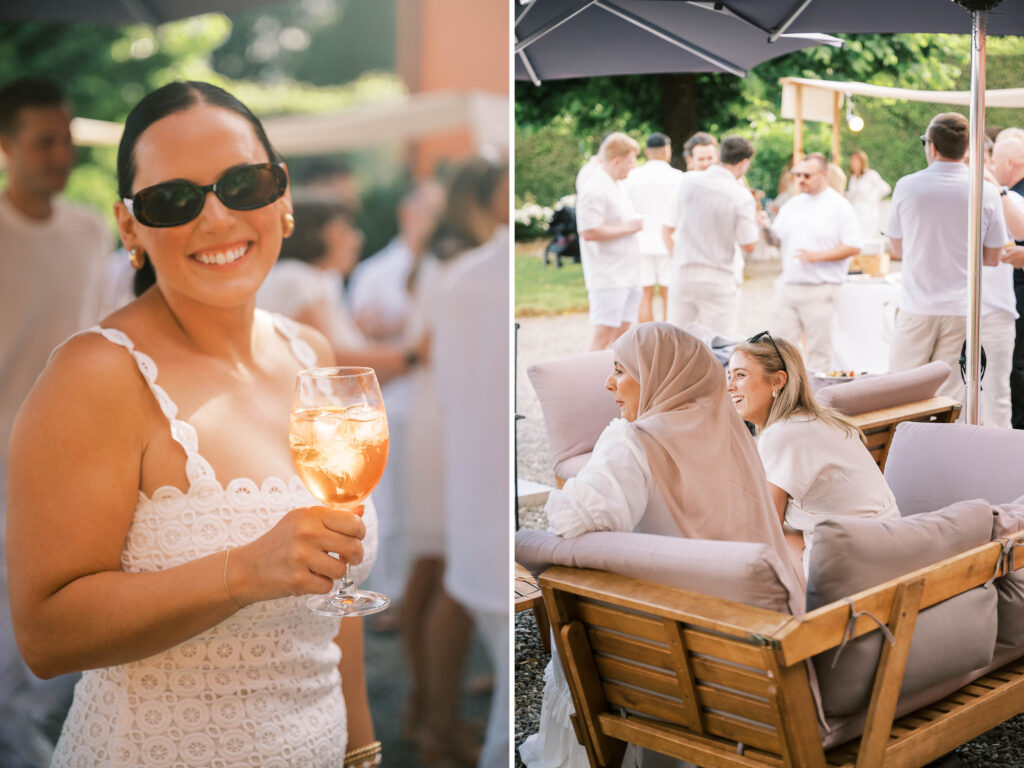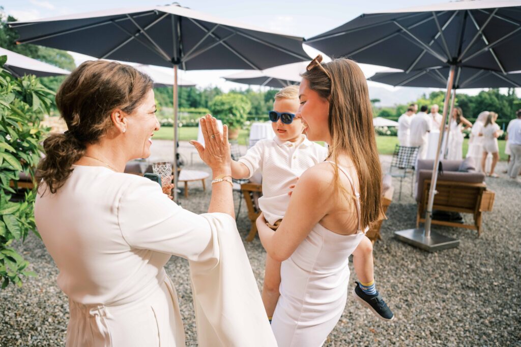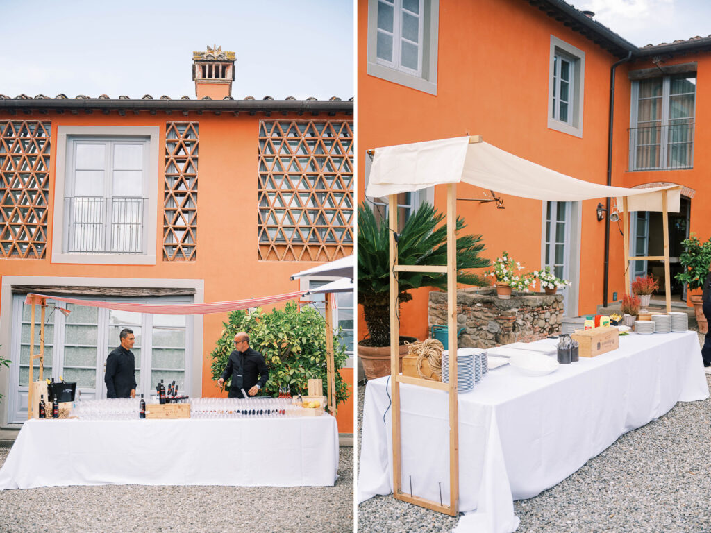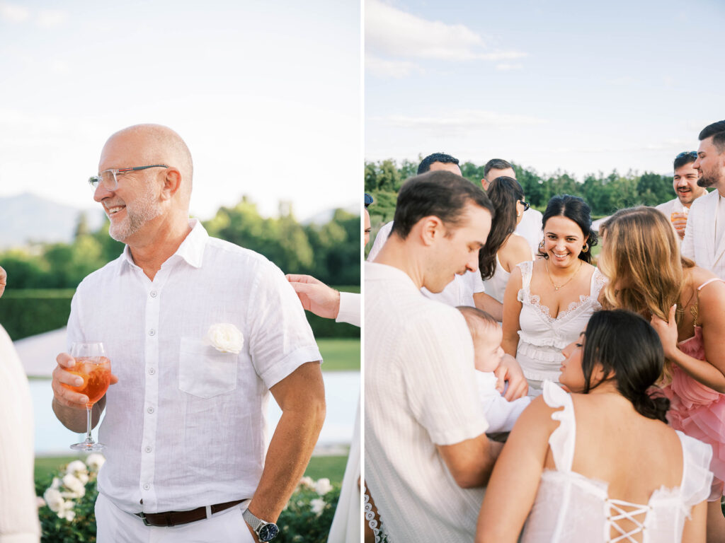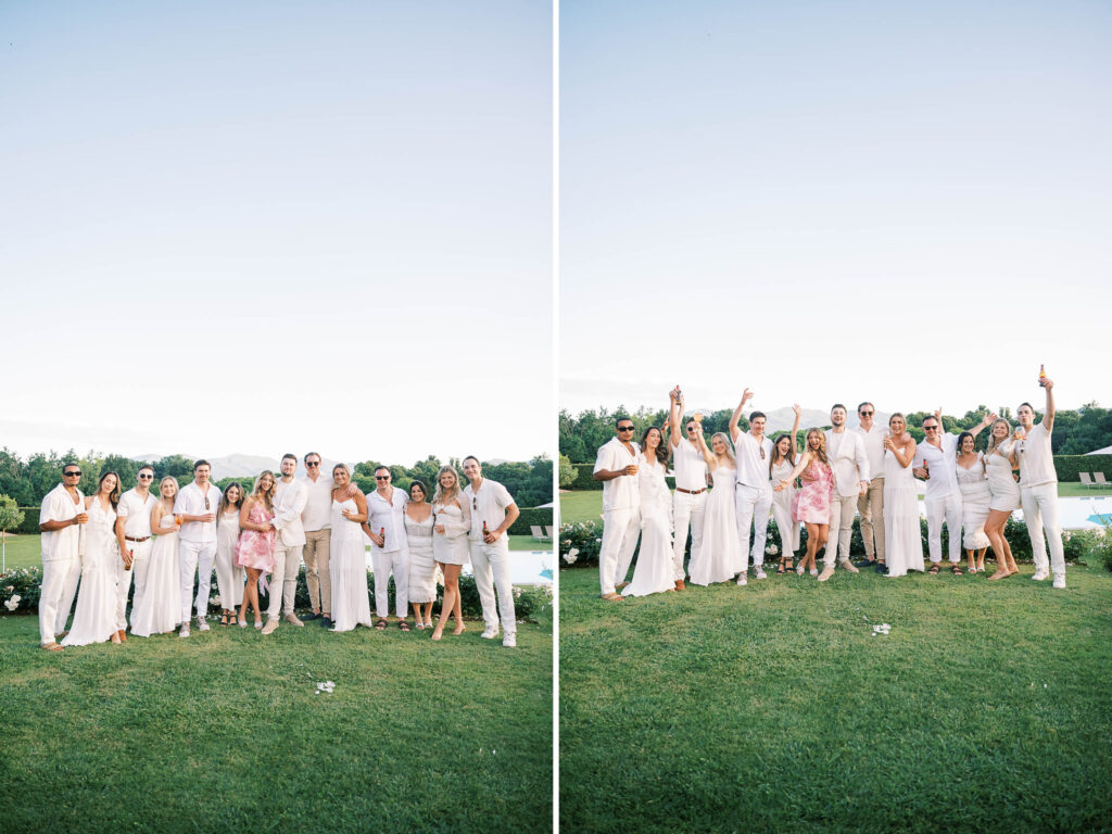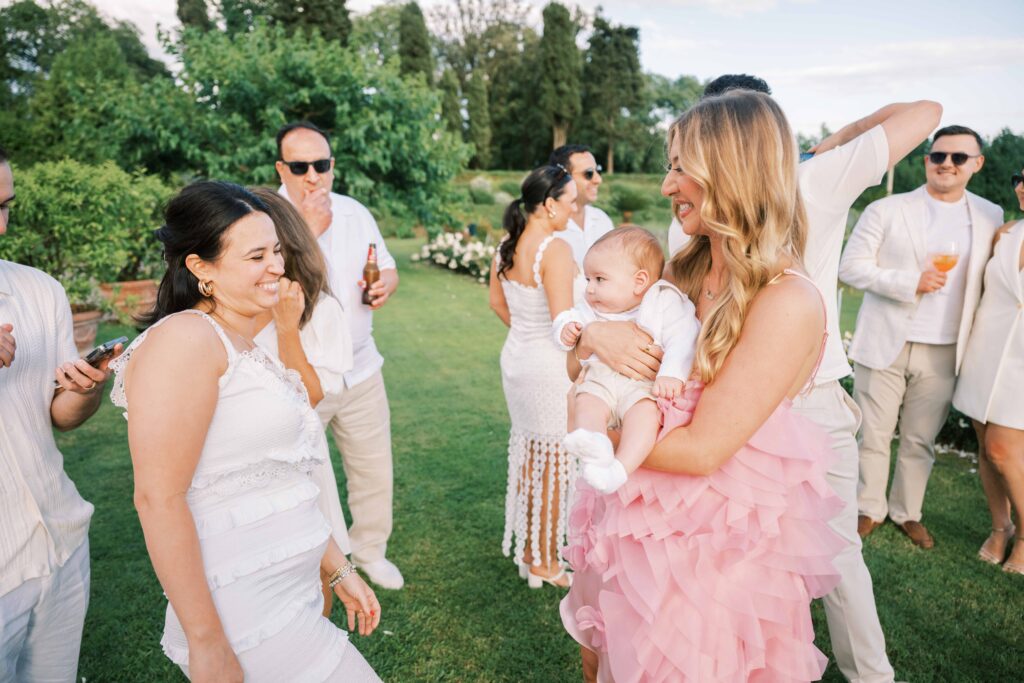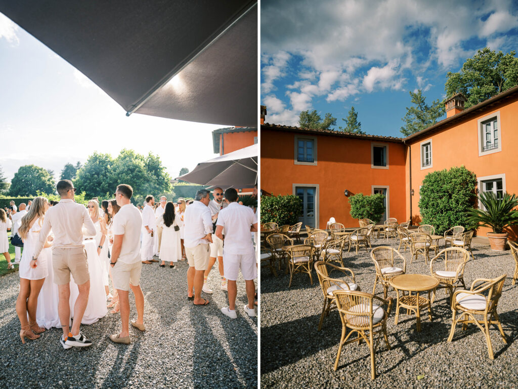 Maria and Josh’s welcome party was the perfect opening scene. Set against the dreamy backdrop of Lucca in the Tuscan countryside, the evening felt fresh, electric, and full of anticipation. All of the guests arrived dressed in white—an inspired choice that felt effortlessly chic and fitting for the Italian setting. Crisp linens, glowing skin, laughter echoing through the space—it was bright, airy, and buzzing with energy.