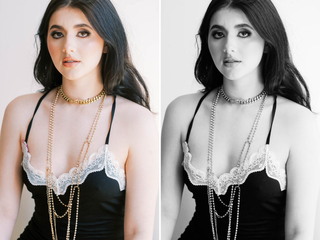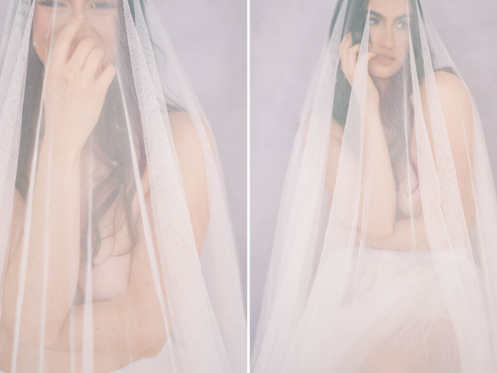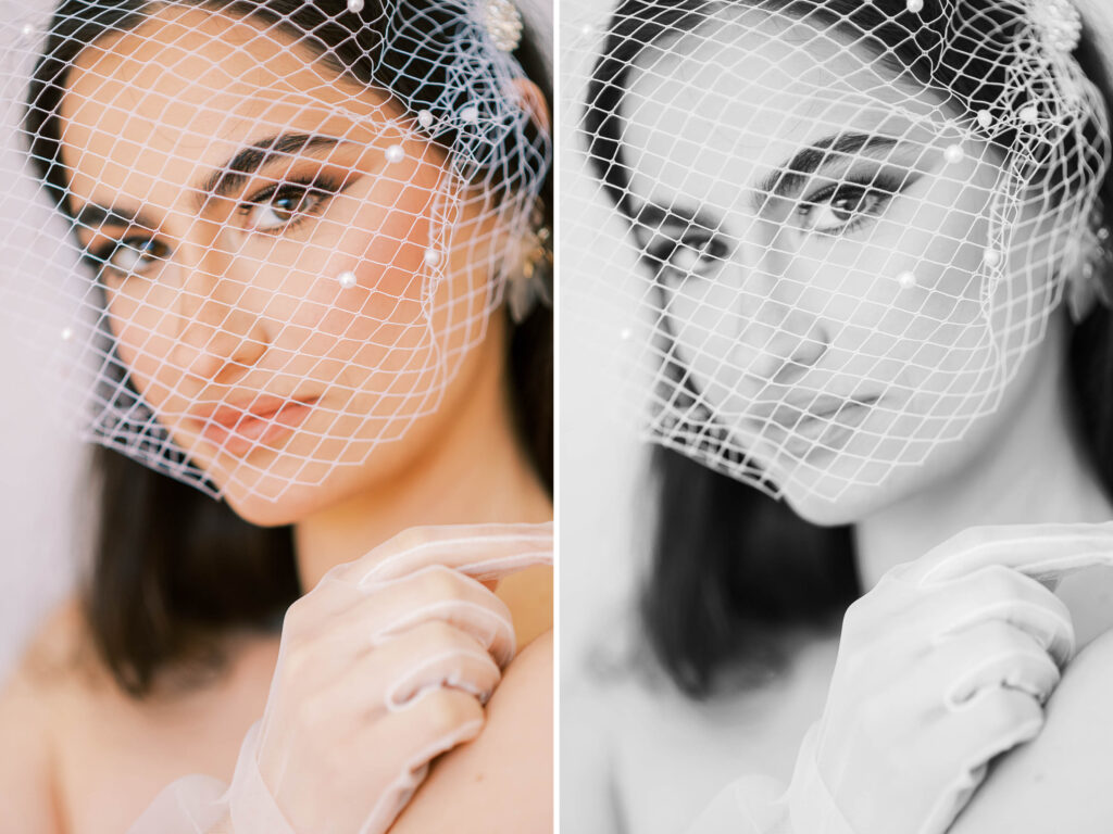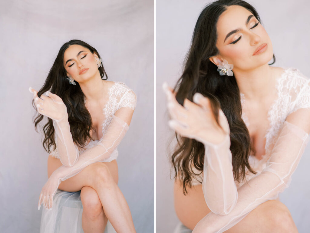 In this session, one of our lovely models wore white while the other showcased elegant black ensembles. We used sheer opera gloves, a pearl beaded crop top, a mini birdcage veil, and, my favorite, sheer tulle skirts that came in both black and white. Oh! And I can’t forget the delicate floral earrings for the soft bridal look and the bold chains for a flirty look.