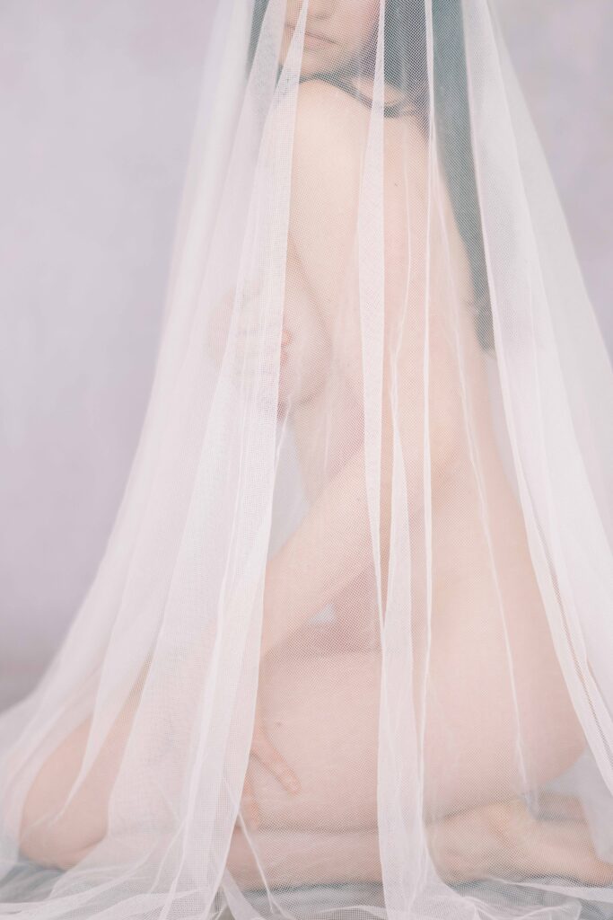 Lace, silk, and sheer fabrics bring magic to boudoir sessions. These materials allow us to play with light and shadow to reveal just enough. A sheer robe, lace slip, or borrowed button-down adds romance and movement without showing more than you want. The way fabric drapes and catches light is part of the allure. Layers and textures—like lace or a cozy sweater—invite curiosity without giving everything away. It’s playful, mysterious, and always beautiful.
