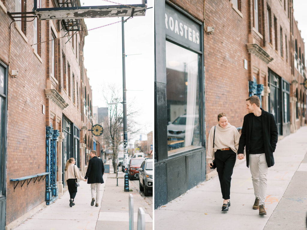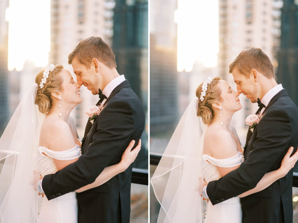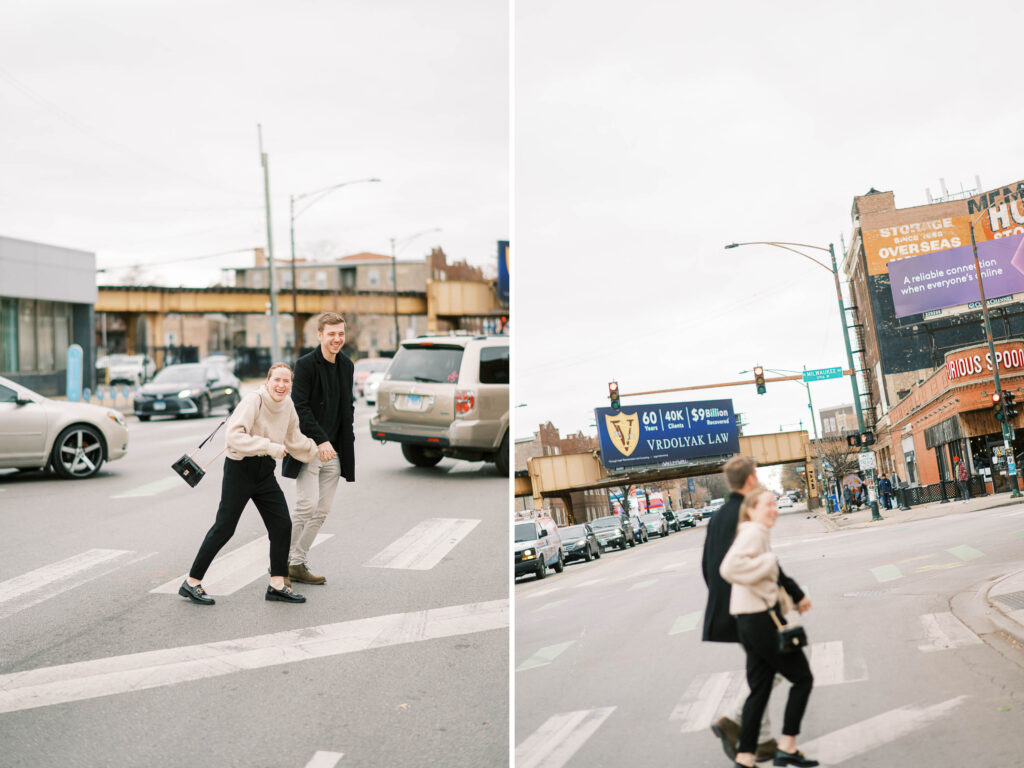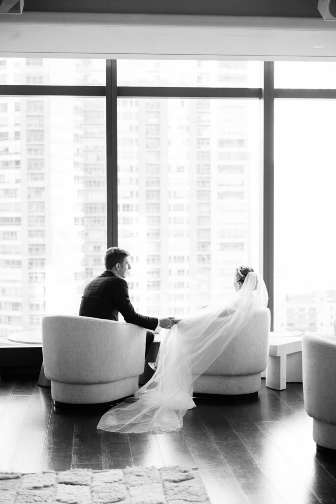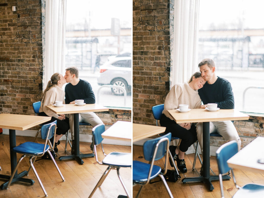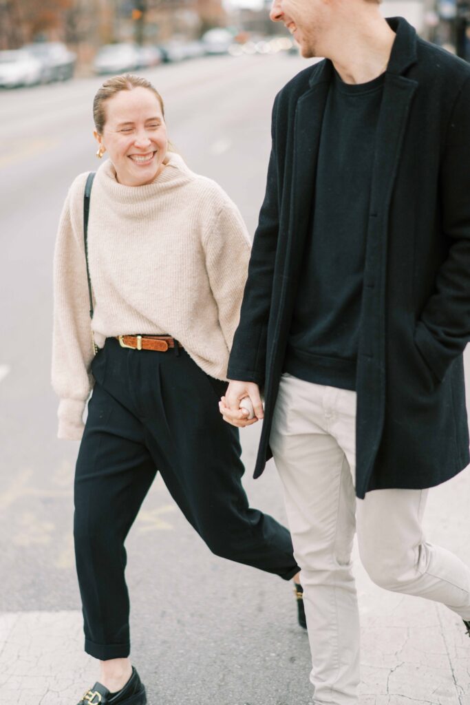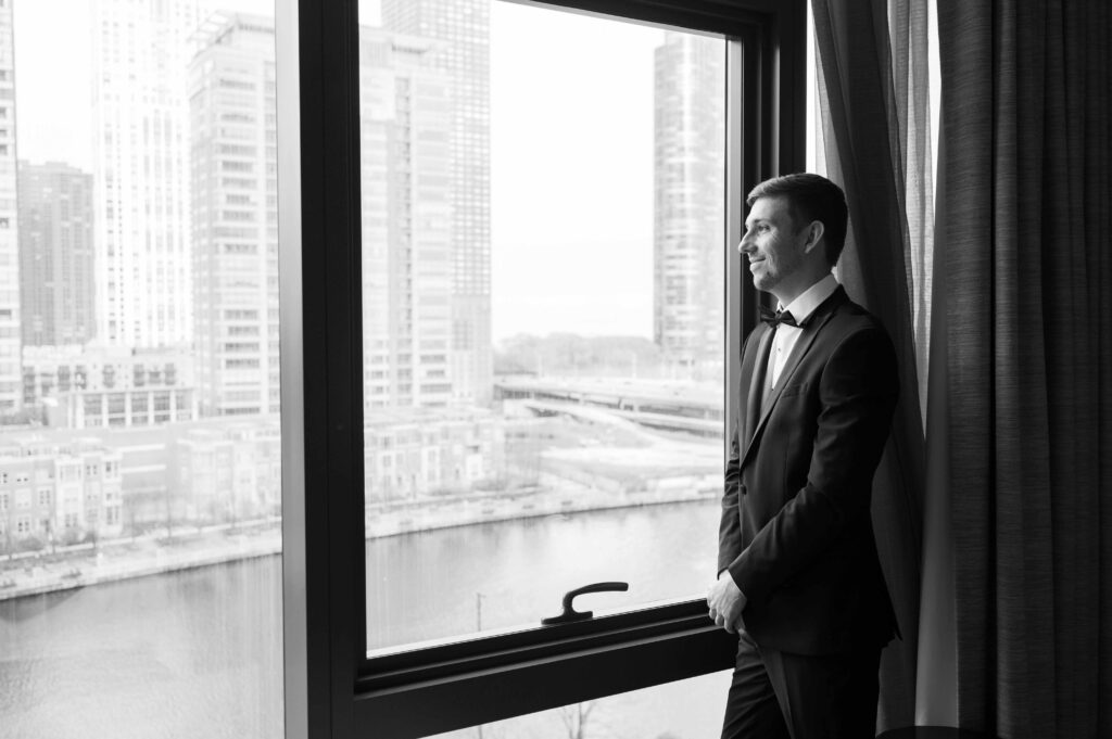 Since Kaley and Jack traveled from across the pond, we added a cozy engagement session the day before their wedding. We started with an intimate shoot inside a Chicago coffee shop. This relaxed moment allowed us to capture the couple’s easy-going personalities and offered a sweet contrast to their black-tie wedding the next day. (Speaking of contrast, I just loved their coffee shop session attire. They flipped their cream and black outfits so she wore a cream top while he wore black and vice versa for the pants. This couple has style!) Their laid-back mini shoot is a reminder to engaged couples everywhere: your wedding weekend doesn’t have to be all grandeur, all the time. Often, the simplest moments become the most treasured.