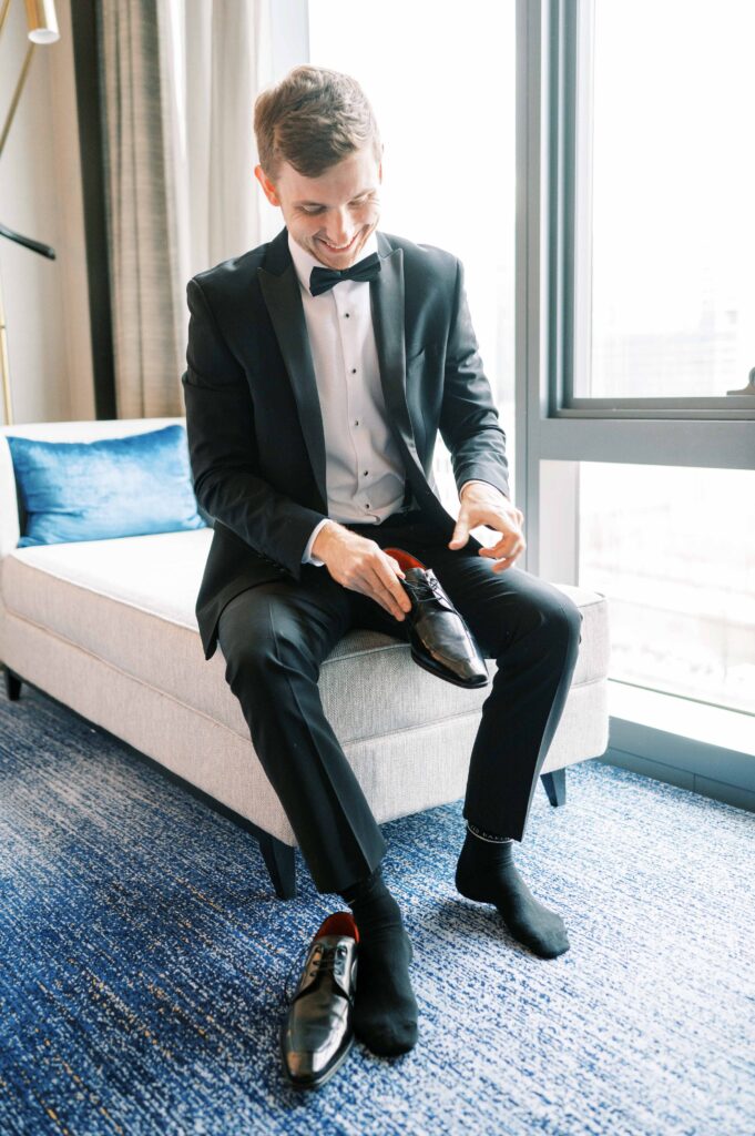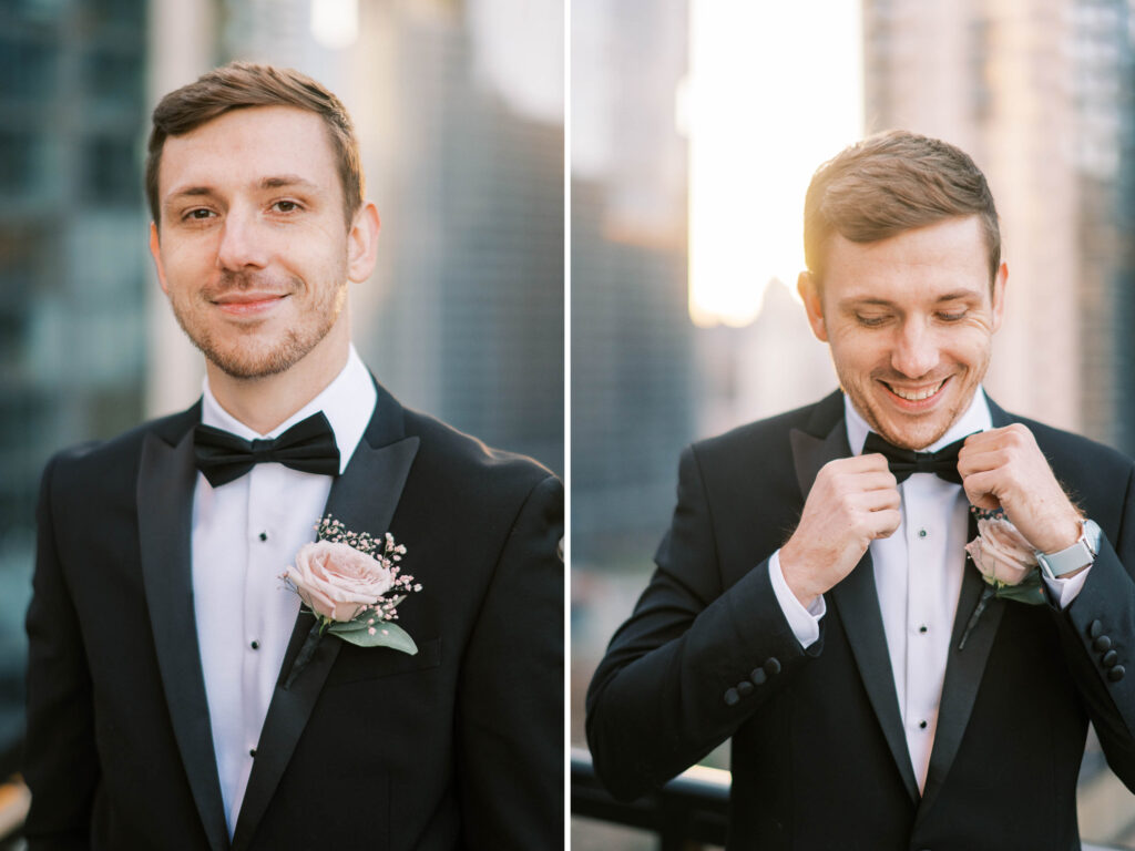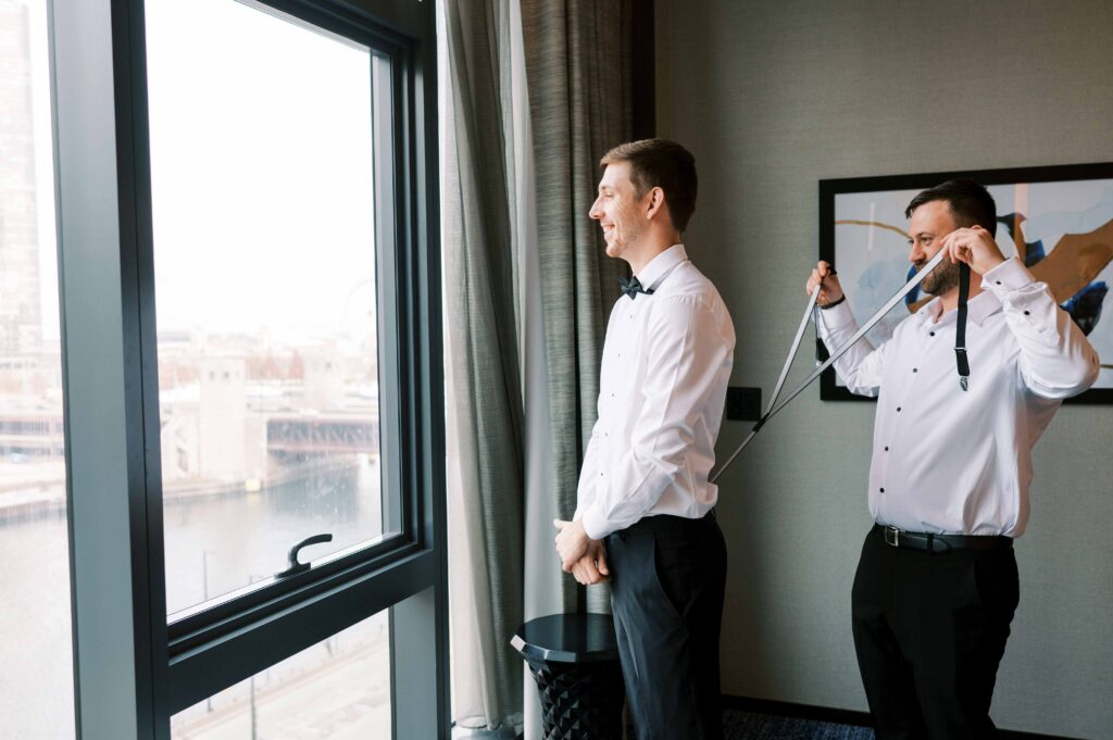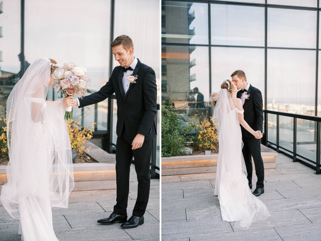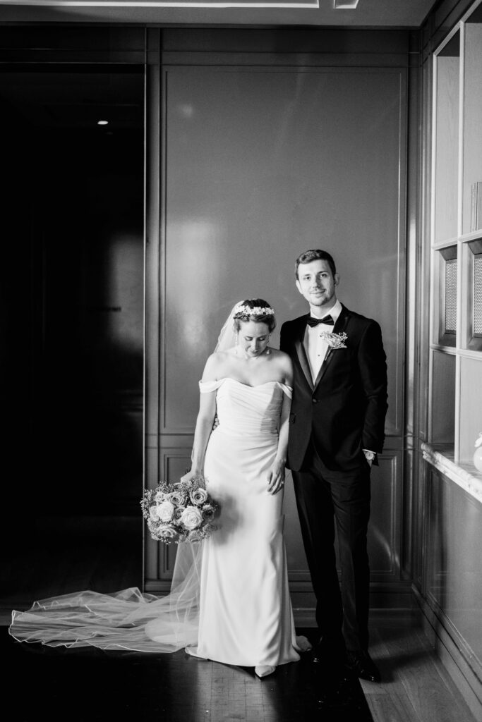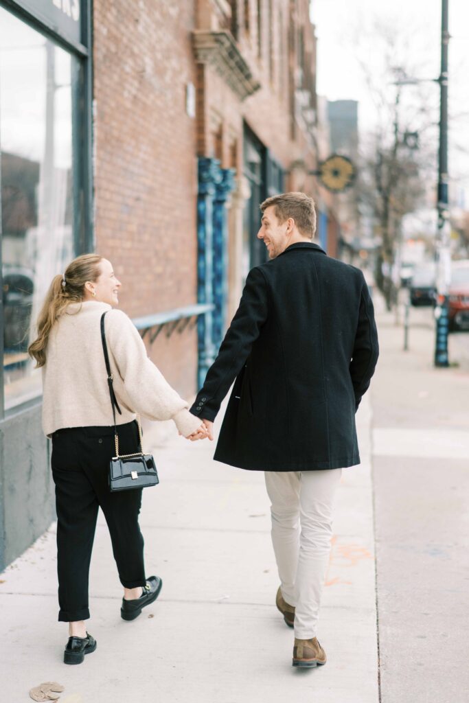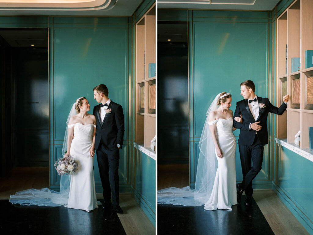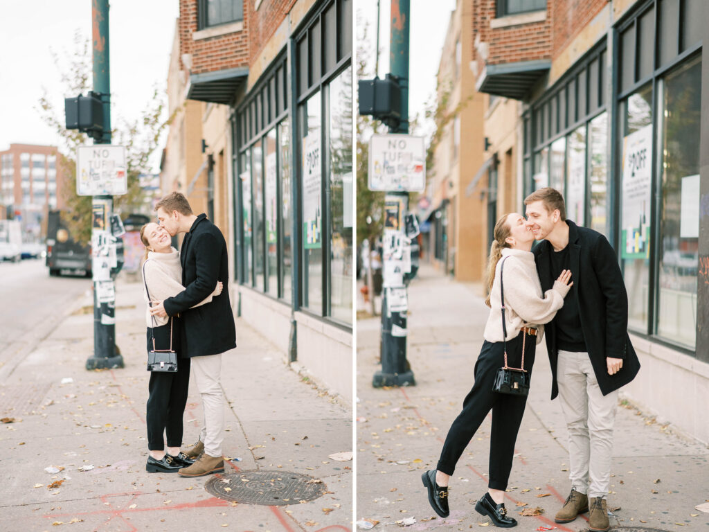 Since Kaley and Jack traveled from across the pond, we added a cozy engagement session the day before their wedding. We started with an intimate shoot inside a Chicago coffee shop. This relaxed moment allowed us to capture the couple’s easy-going personalities and offered a sweet contrast to their black-tie wedding the next day. (Speaking of contrast, I just loved their coffee shop session attire. They flipped their cream and black outfits so she wore a cream top while he wore black and vice versa for the pants. This couple has style!) Their laid-back mini shoot is a reminder to engaged couples everywhere: your wedding weekend doesn’t have to be all grandeur, all the time. Often, the simplest moments become the most treasured.