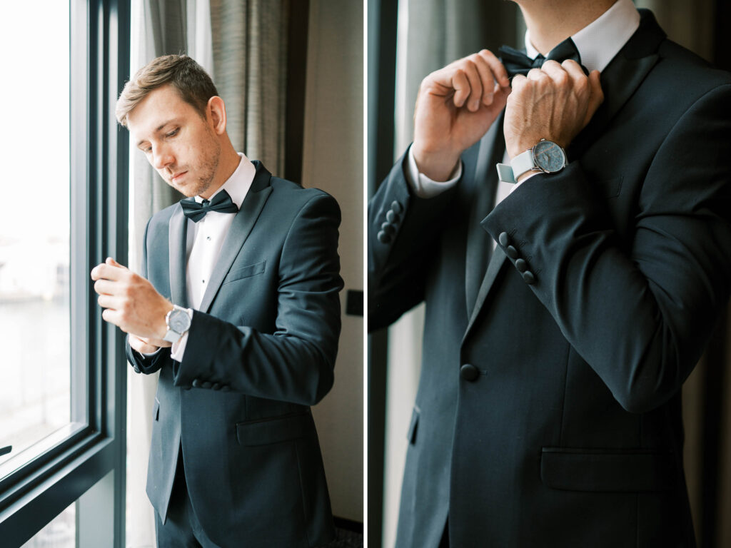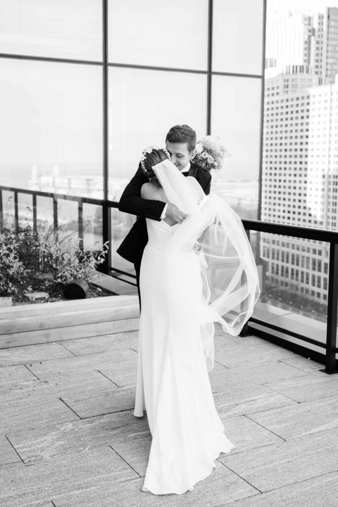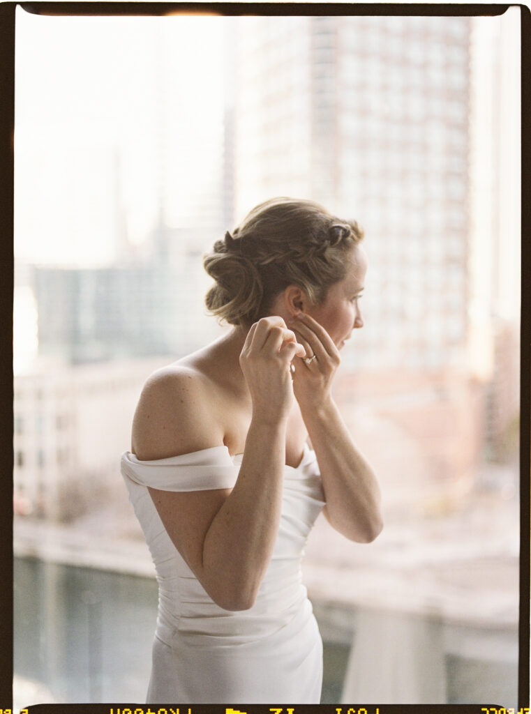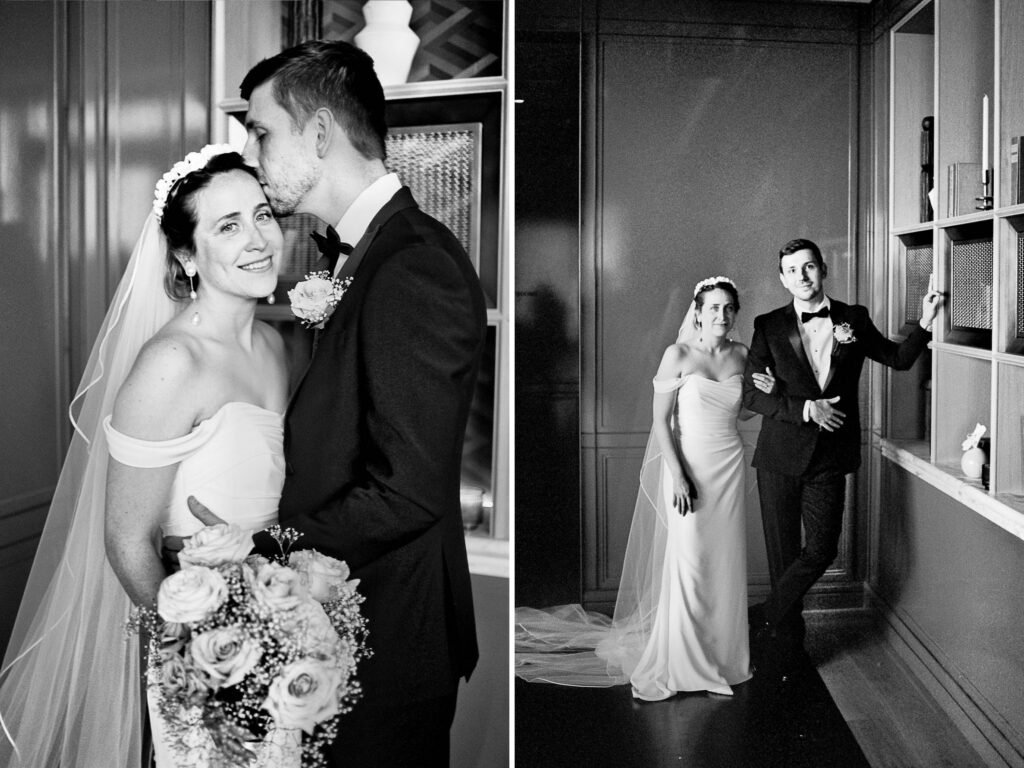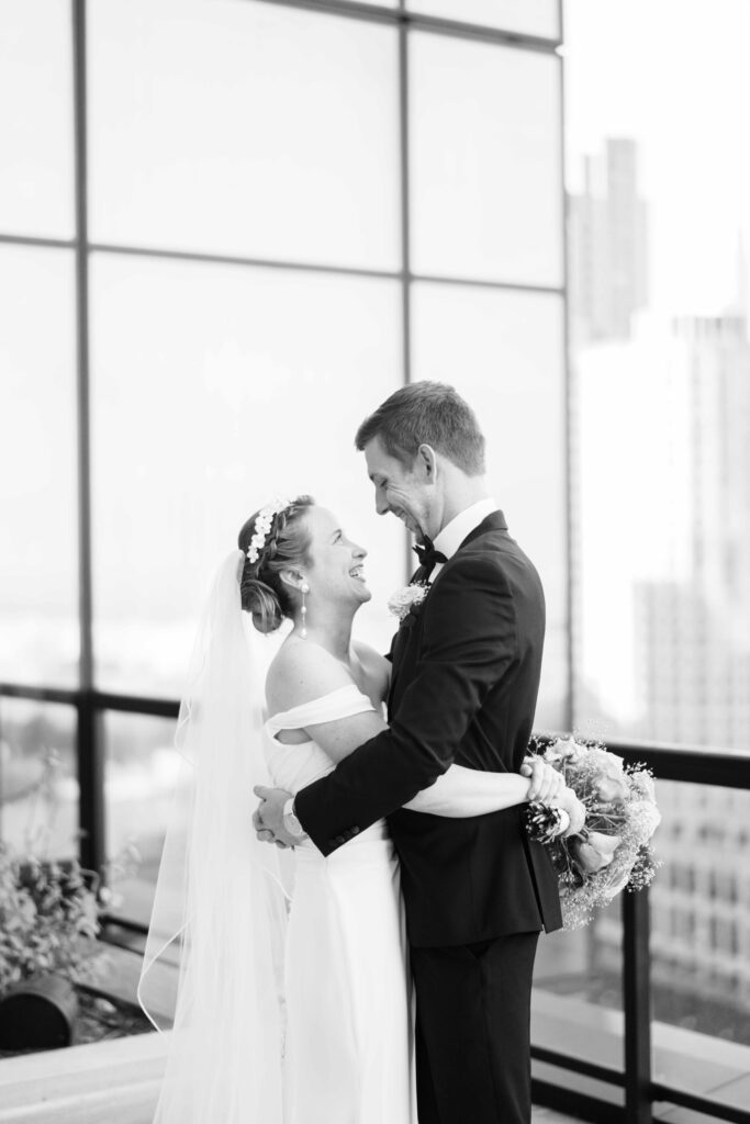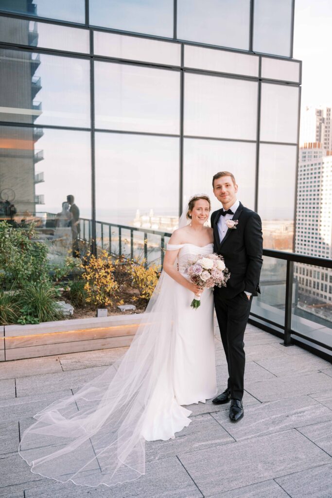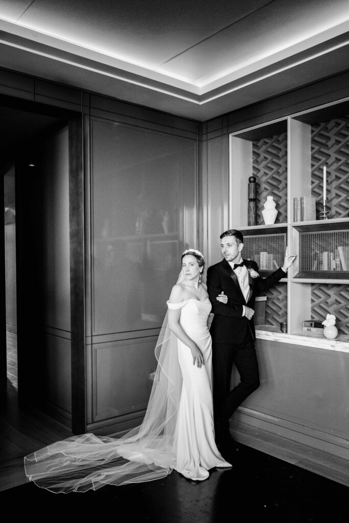 Since Kaley and Jack traveled from across the pond, we added a cozy engagement session the day before their wedding. We started with an intimate shoot inside a Chicago coffee shop. This relaxed moment allowed us to capture the couple’s easy-going personalities and offered a sweet contrast to their black-tie wedding the next day. (Speaking of contrast, I just loved their coffee shop session attire. They flipped their cream and black outfits so she wore a cream top while he wore black and vice versa for the pants. This couple has style!) Their laid-back mini shoot is a reminder to engaged couples everywhere: your wedding weekend doesn’t have to be all grandeur, all the time. Often, the simplest moments become the most treasured.