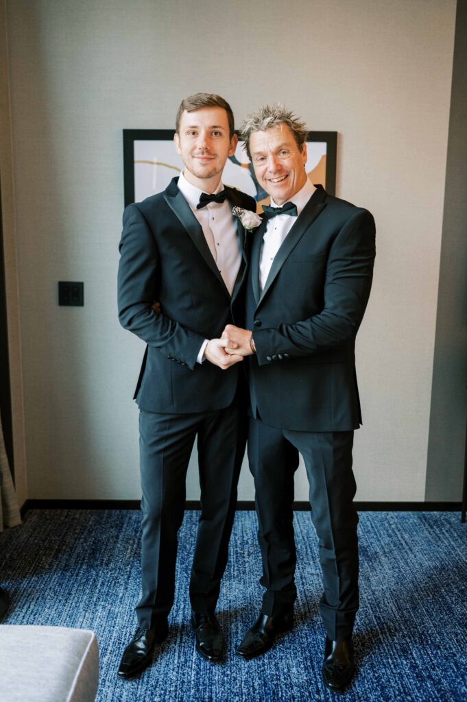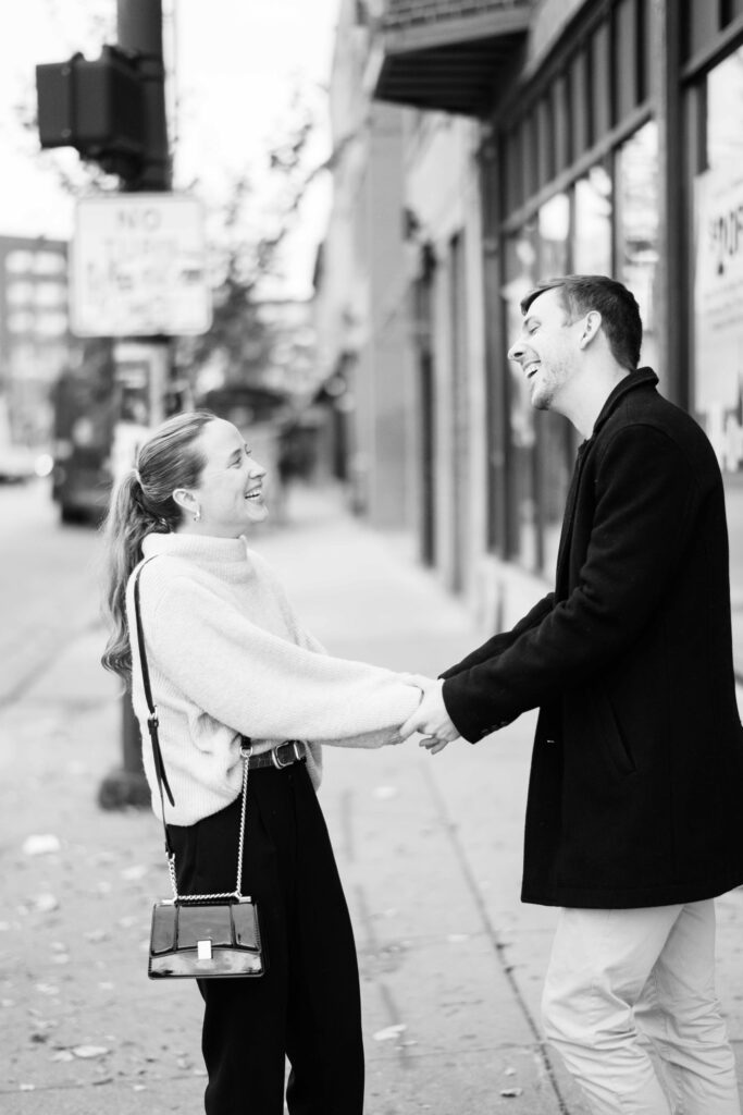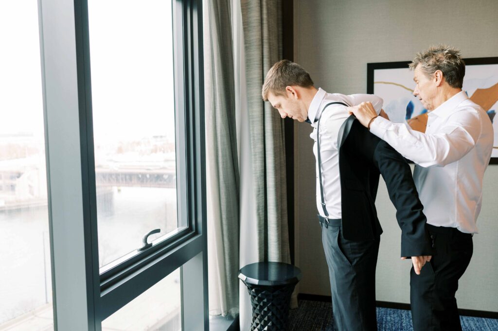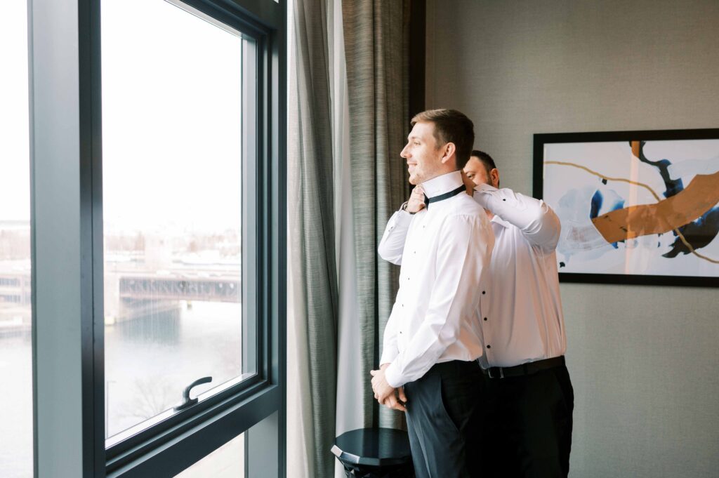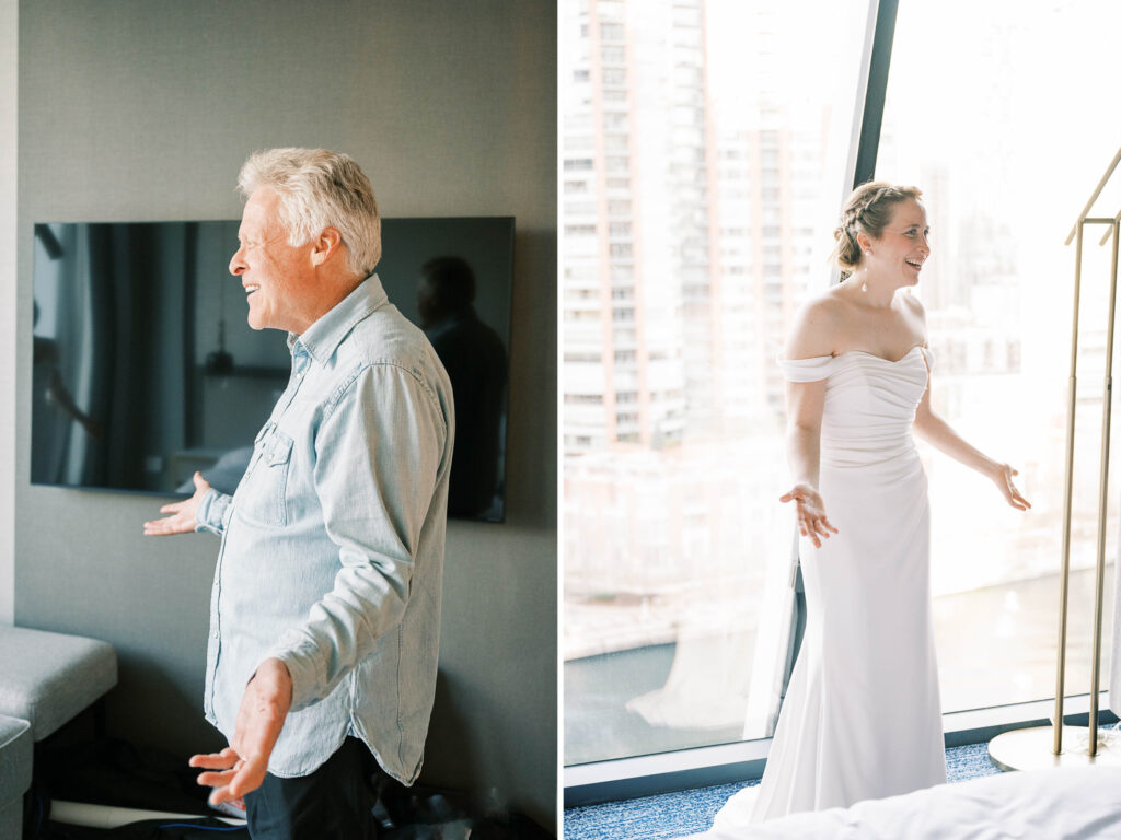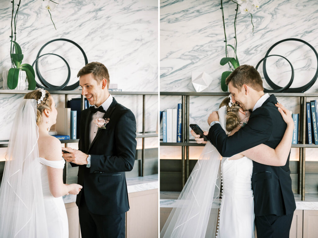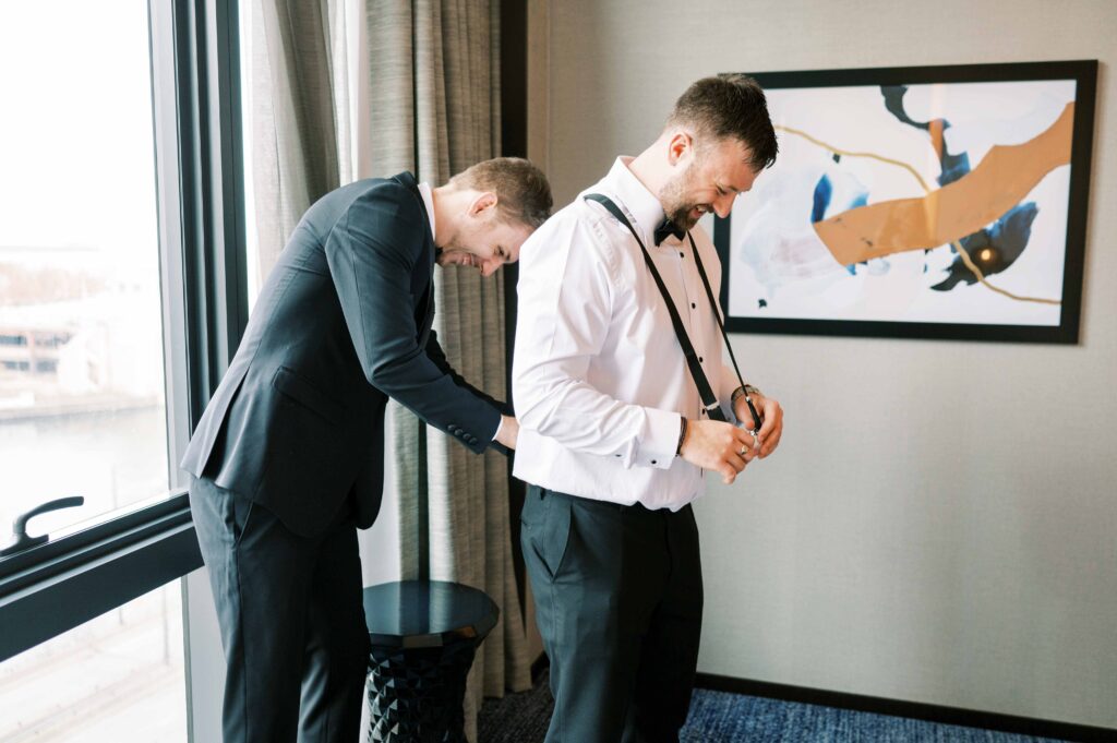 Since Kaley and Jack traveled from across the pond, we added a cozy engagement session the day before their wedding. We started with an intimate shoot inside a Chicago coffee shop. This relaxed moment allowed us to capture the couple’s easy-going personalities and offered a sweet contrast to their black-tie wedding the next day. (Speaking of contrast, I just loved their coffee shop session attire. They flipped their cream and black outfits so she wore a cream top while he wore black and vice versa for the pants. This couple has style!) Their laid-back mini shoot is a reminder to engaged couples everywhere: your wedding weekend doesn’t have to be all grandeur, all the time. Often, the simplest moments become the most treasured.