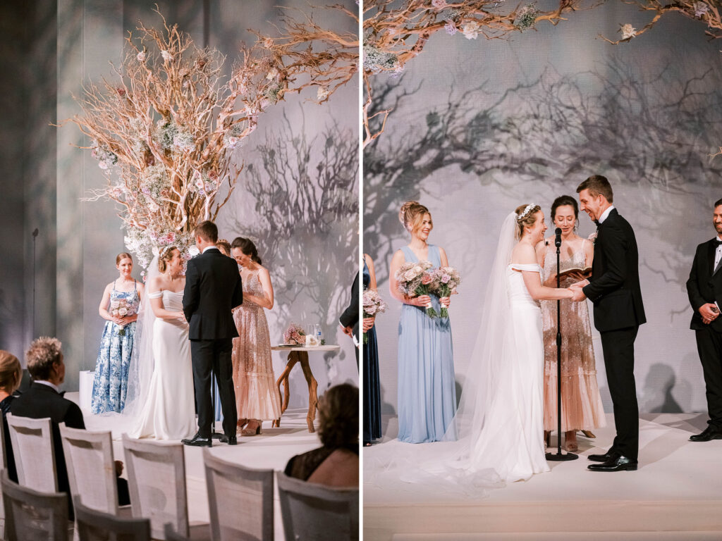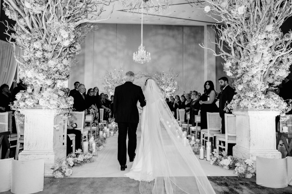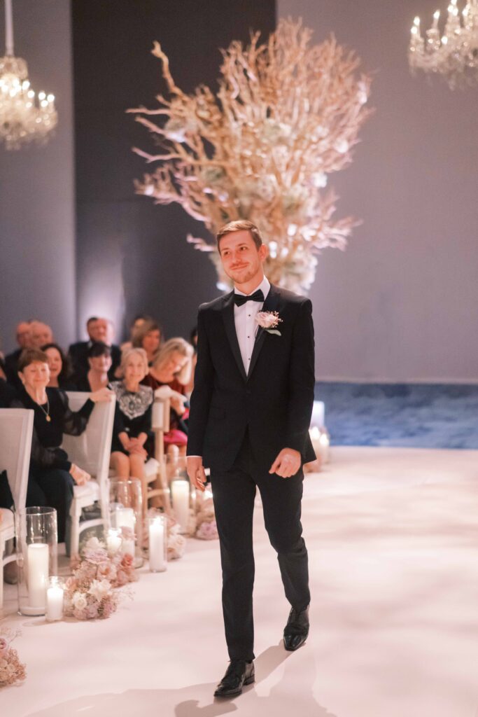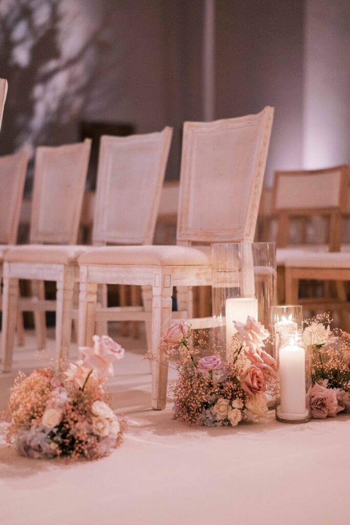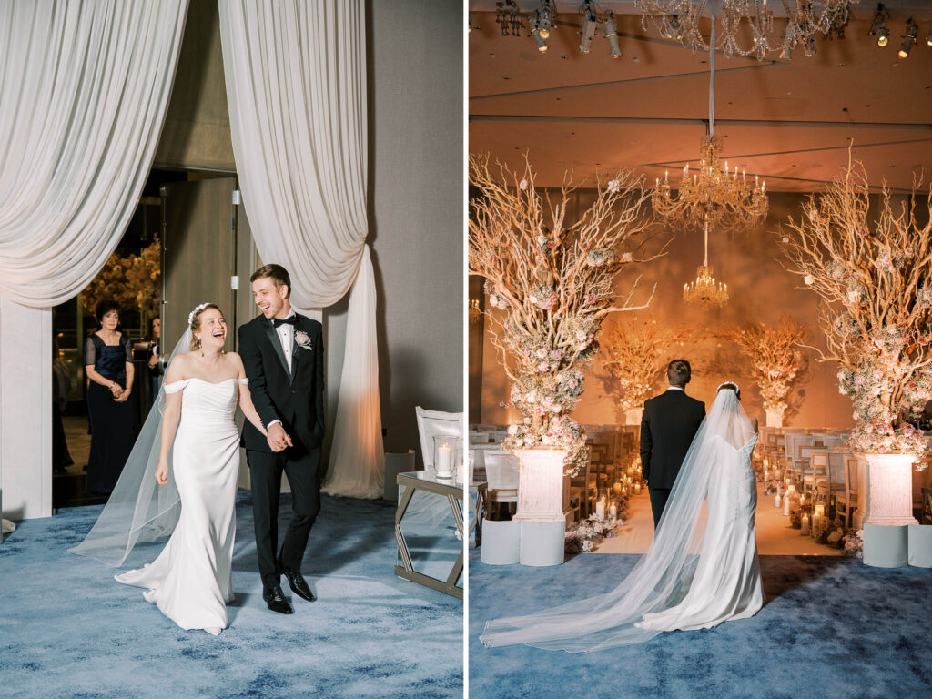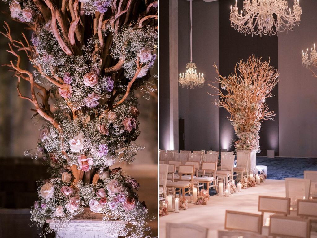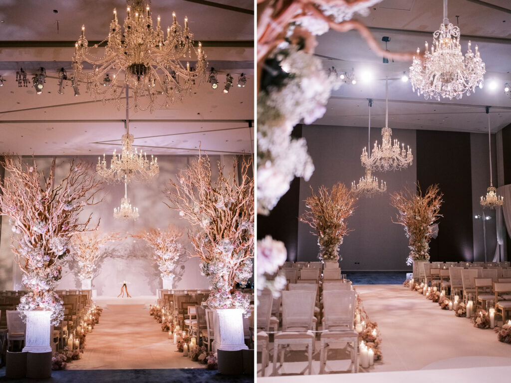As I made my way into the ceremony space, my breath caught. Candlelight danced along the aisle, punctuated by abundant arrangements of whimsical florals. Overhead, glowing chandeliers illuminated bare branches woven with blooms, creating an installation that felt equal parts modern and romantic.