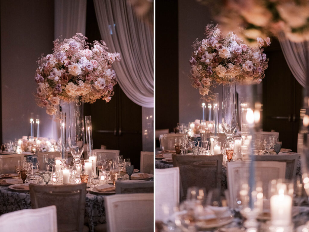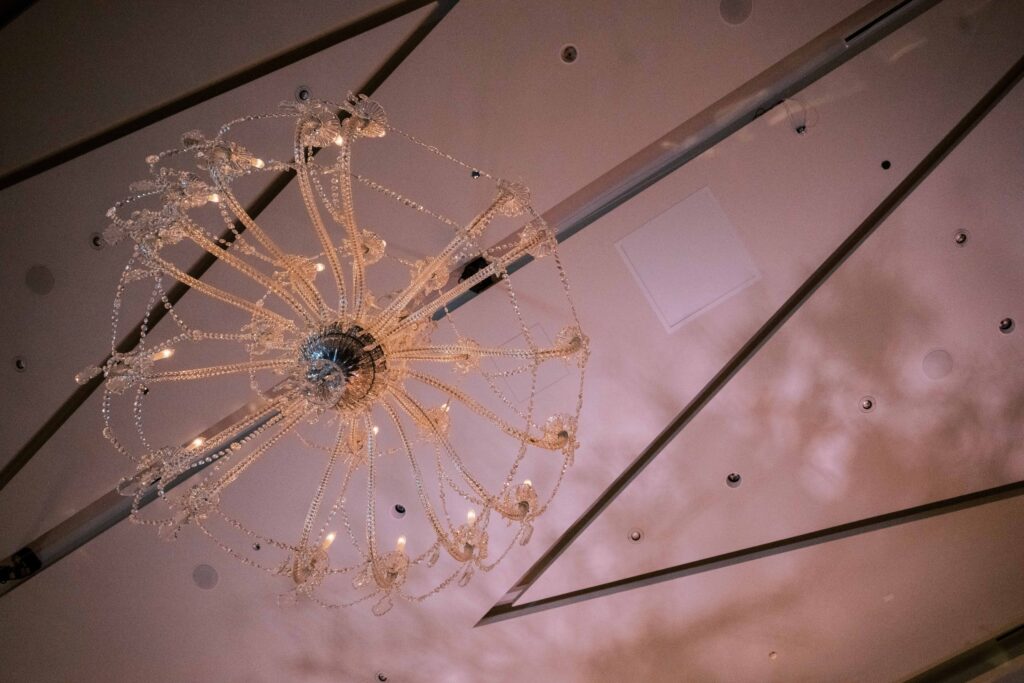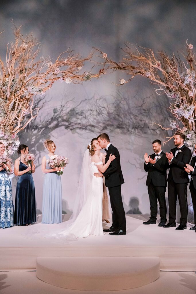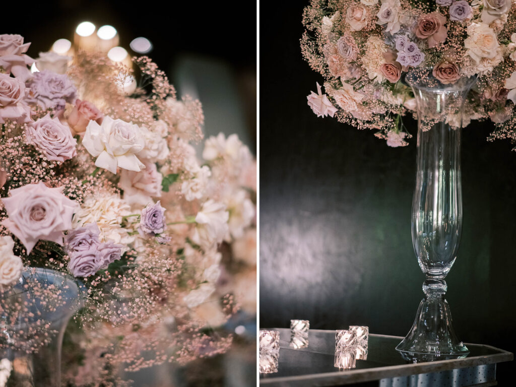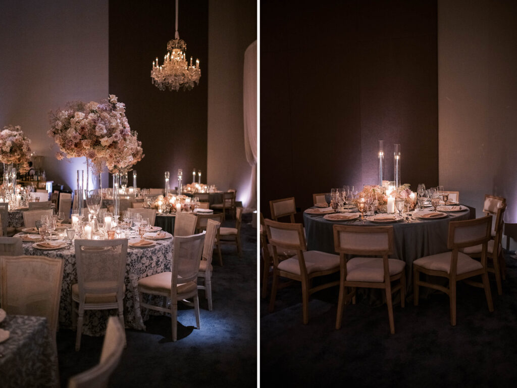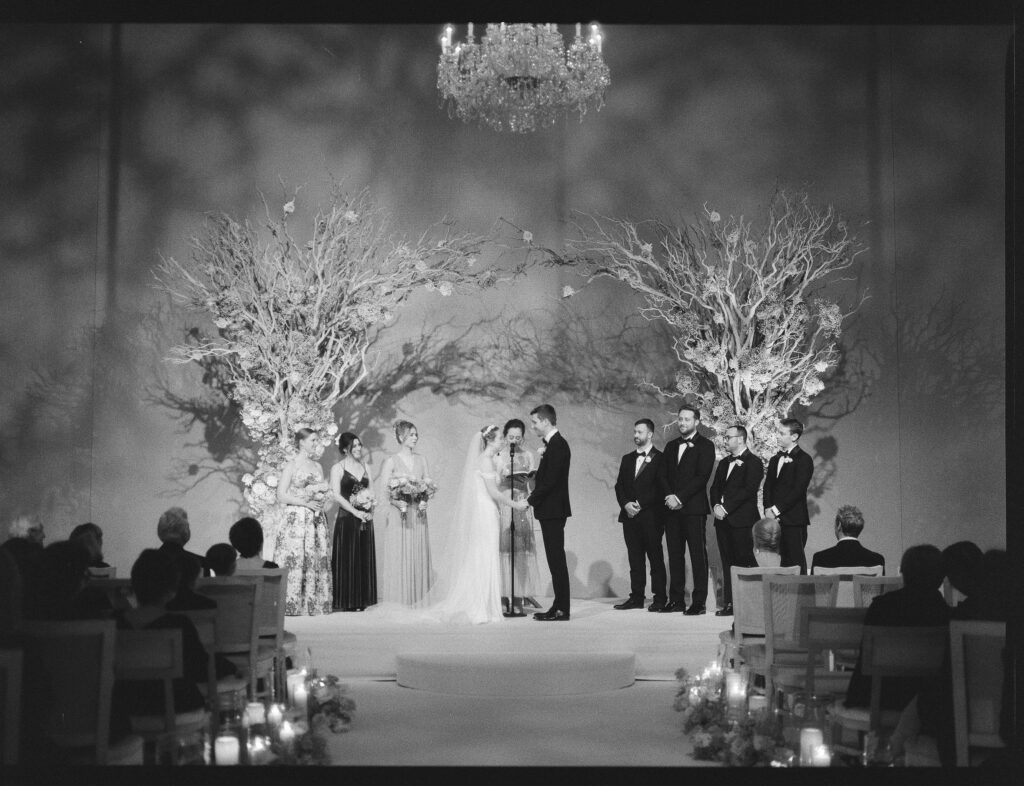 As I made my way into the ceremony space, my breath caught. Candlelight danced along the aisle, punctuated by abundant arrangements of whimsical florals. Overhead, glowing chandeliers illuminated bare branches woven with blooms, creating an installation that felt equal parts modern and romantic.