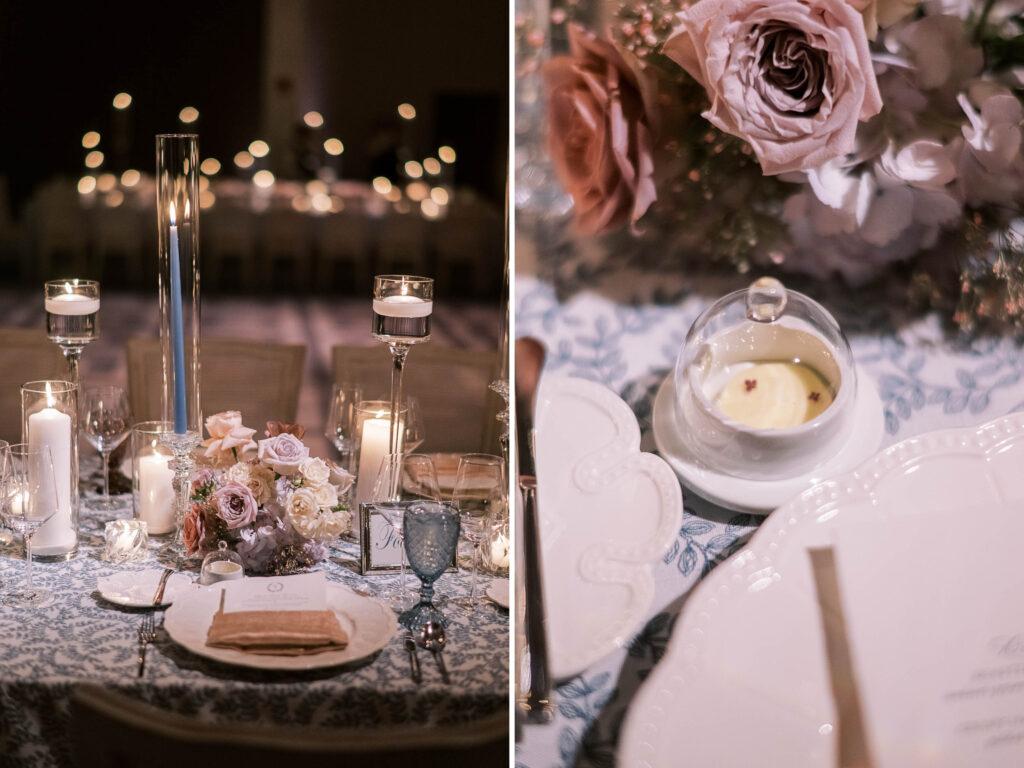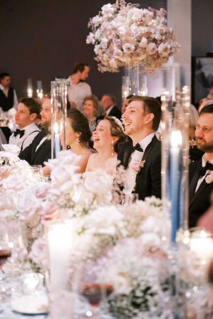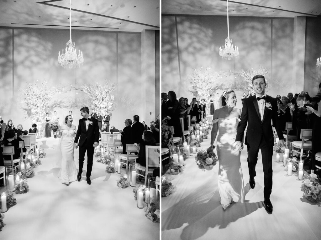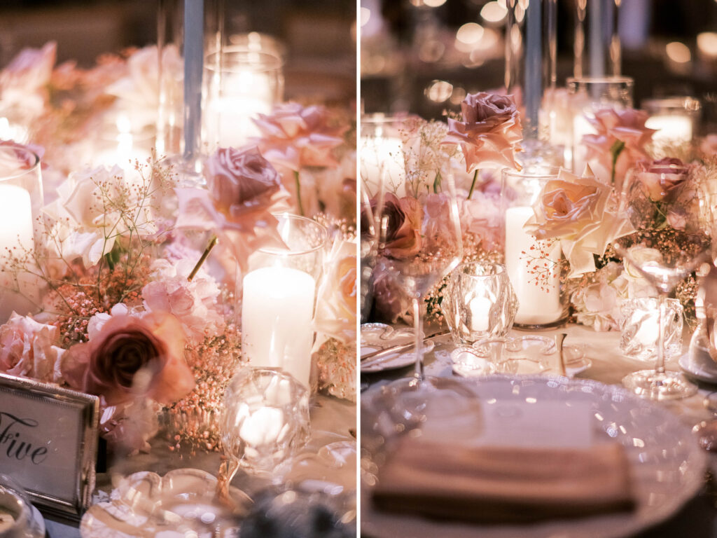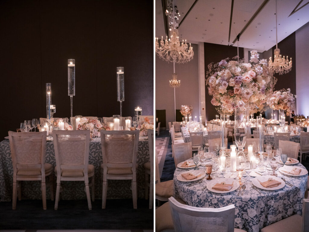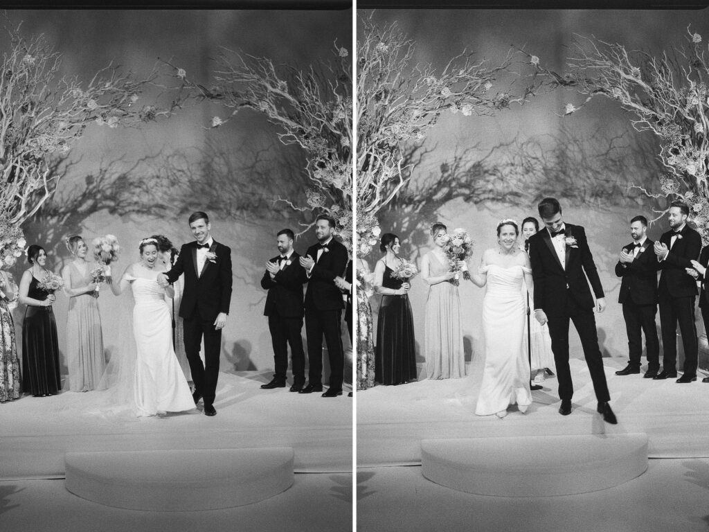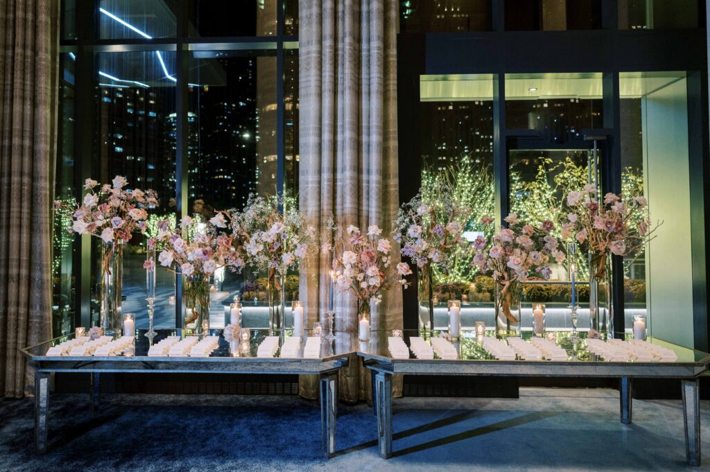 As I made my way into the ceremony space, my breath caught. Candlelight danced along the aisle, punctuated by abundant arrangements of whimsical florals. Overhead, glowing chandeliers illuminated bare branches woven with blooms, creating an installation that felt equal parts modern and romantic.