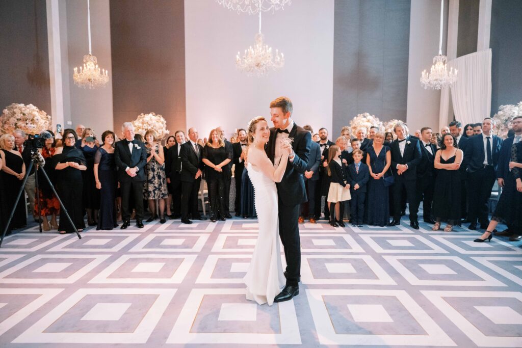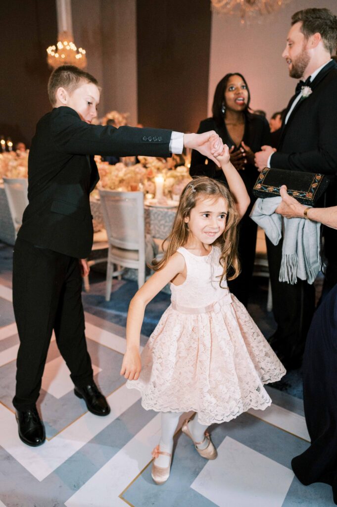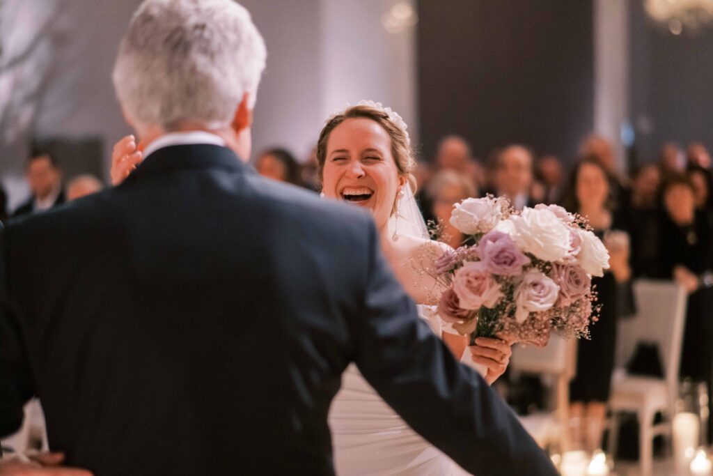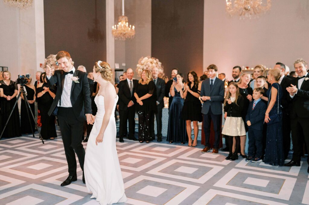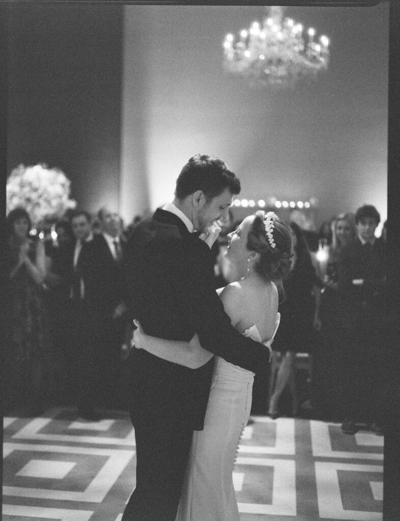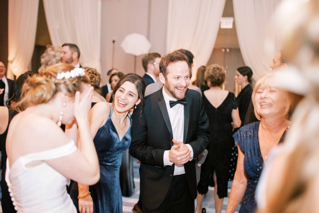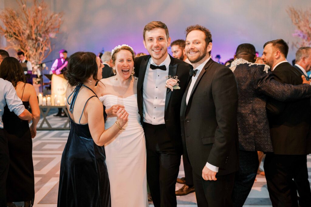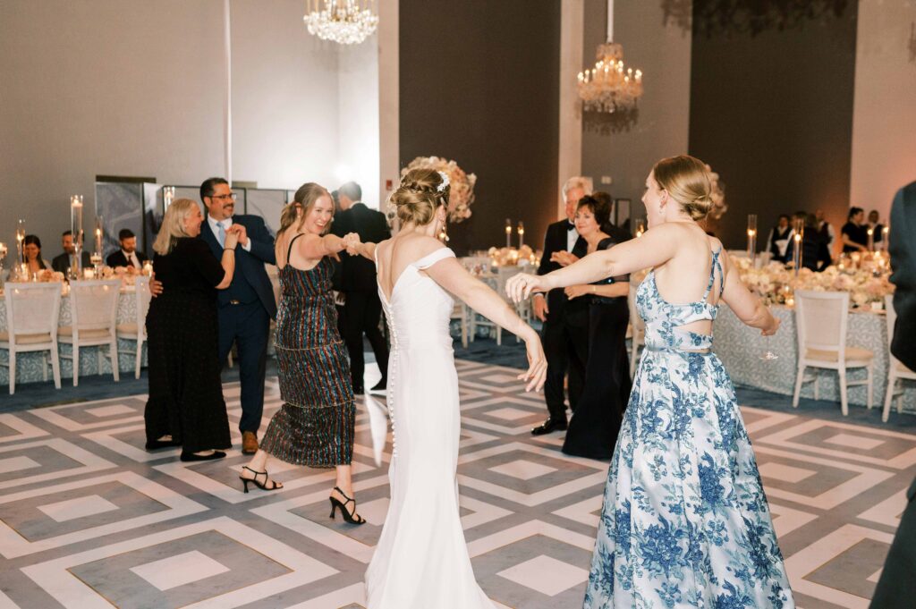One of my favorite things about this couple? How they incorporated their individual passions into their wedding day. Kaley’s love for whimsical florals shone throughout the decor. Soft petals cascaded over the ceremony altar and subtle petal appliqués adorned the table linens. Then, there was the most stunning four-tiered cake I’ve ever laid eyes on. Jack’s passion for music infused their celebration with spectacular energy. An orchestra serenaded the ceremony, a jazz band set the tone for cocktail hour, and, as a surprise, one bridesmaid performed a heartfelt guitar piece.