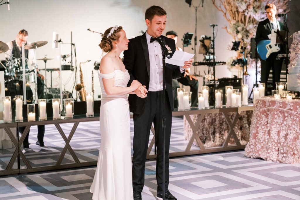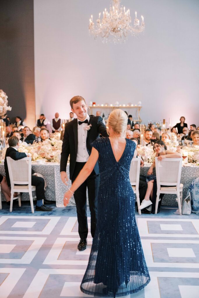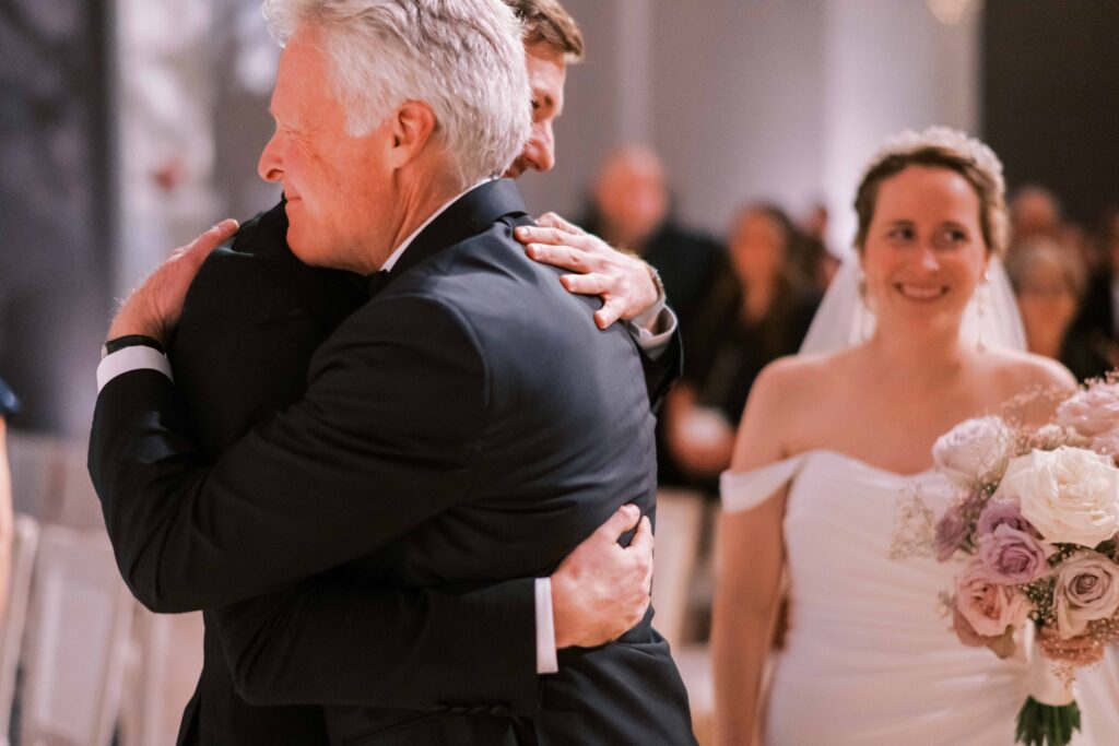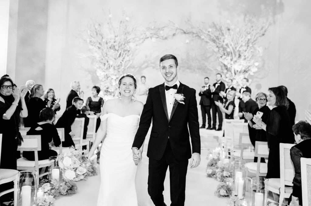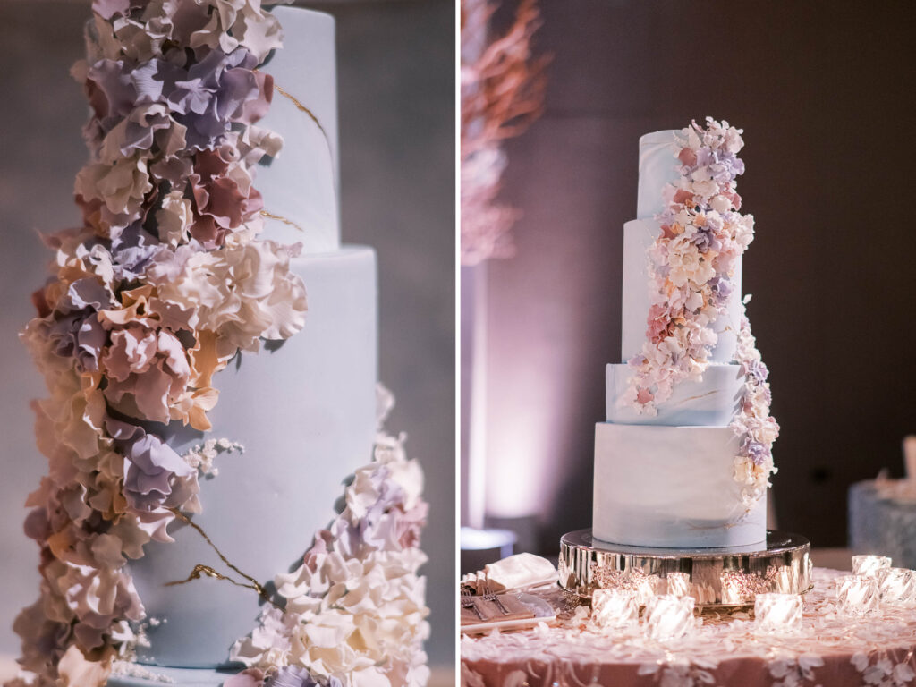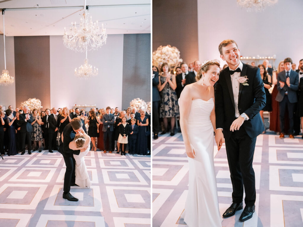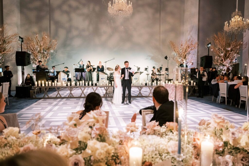 One of my favorite things about this couple? How they incorporated their individual passions into their wedding day. Kaley’s love for whimsical florals shone throughout the decor. Soft petals cascaded over the ceremony altar and subtle petal appliqués adorned the table linens. Then, there was the most stunning four-tiered cake I’ve ever laid eyes on. Jack’s passion for music infused their celebration with spectacular energy. An orchestra serenaded the ceremony, a jazz band set the tone for cocktail hour, and, as a surprise, one bridesmaid performed a heartfelt guitar piece.