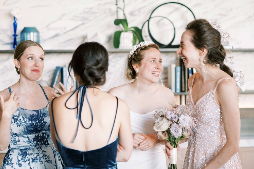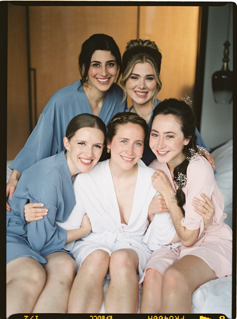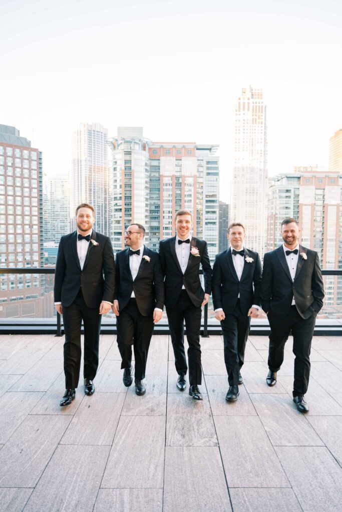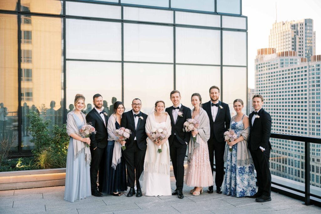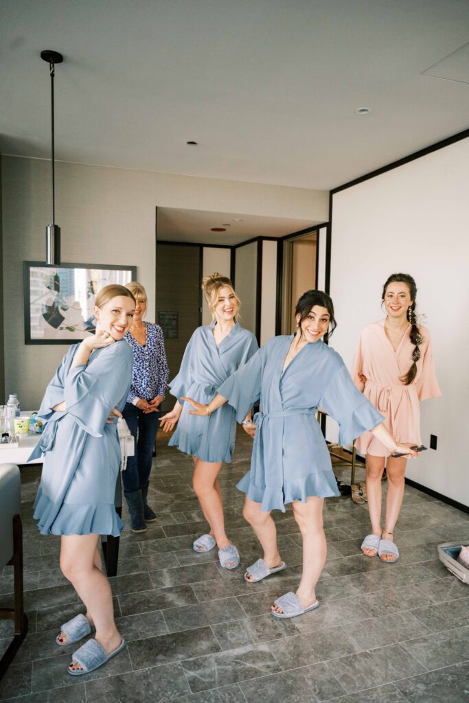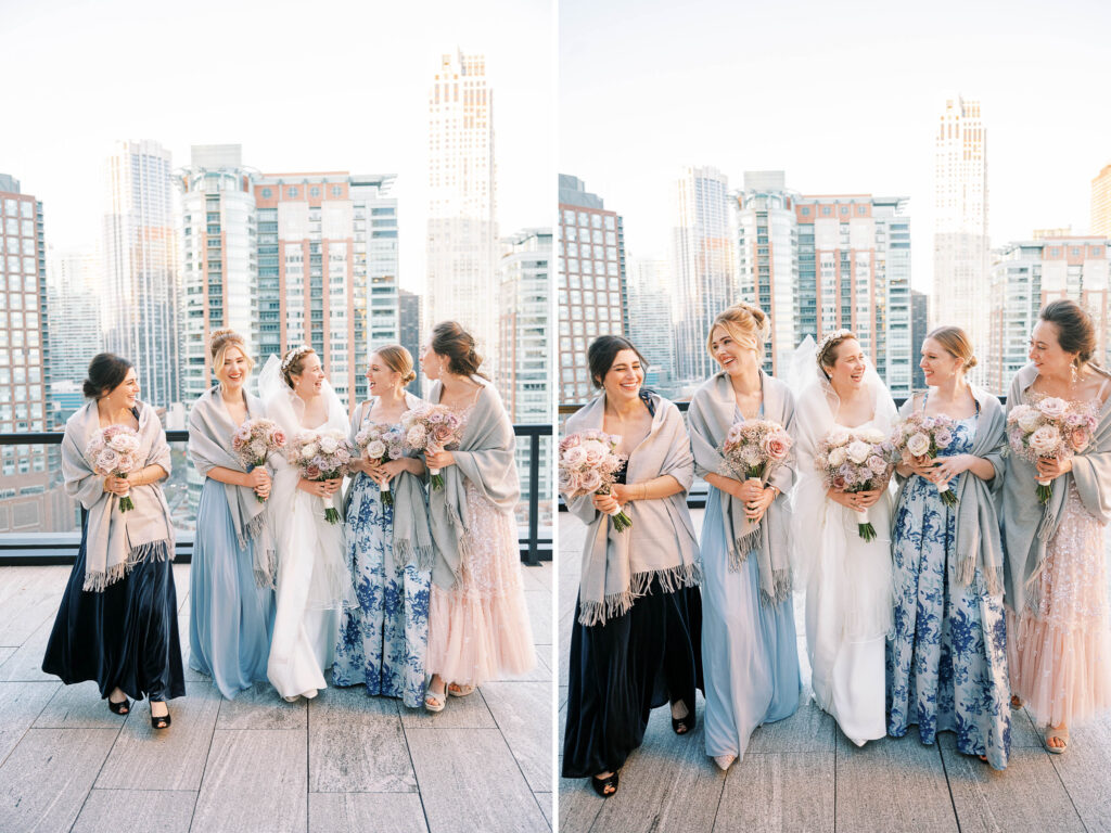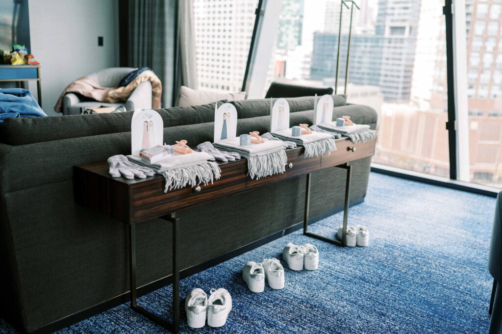 When I walked into Kaley’s bridal suite, it became clear this wasn’t just another wedding. Thoughtful details seemed to be everywhere: bridesmaid boxes filled with goodies like chic reception sneakers and cozy shawls (perfect for the rooftop chill!). Even their invitation suite showcased adorable custom illustrations of each wedding party member. It’s these tiny personal touches that guests always remember.