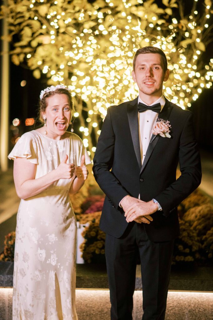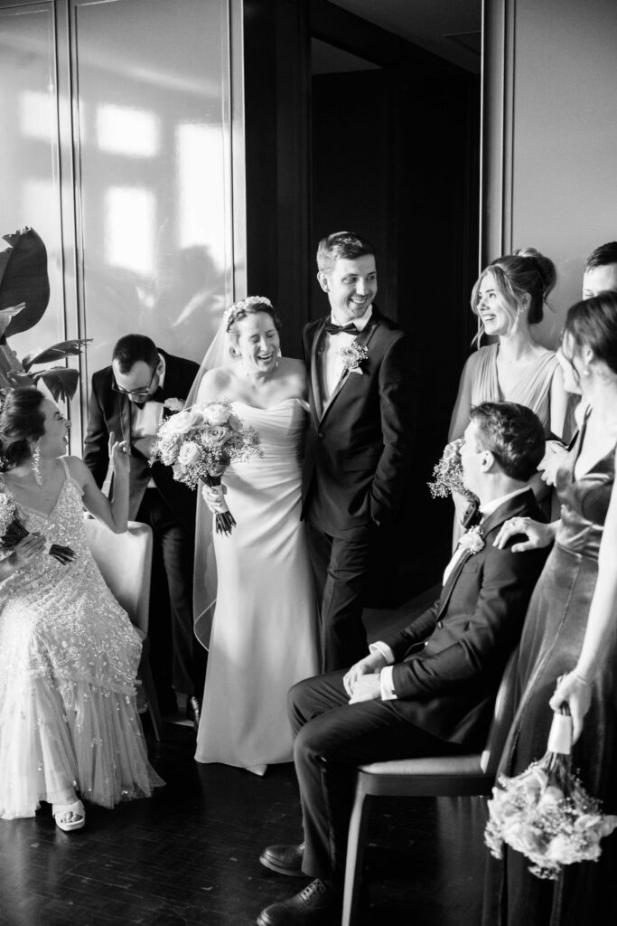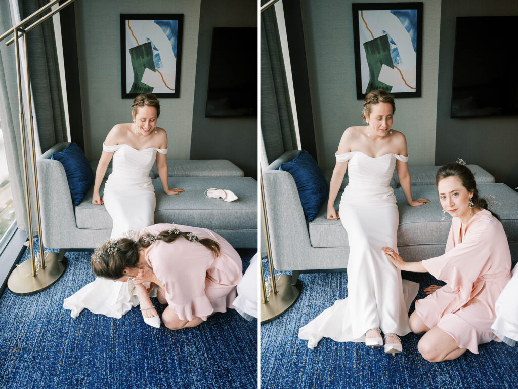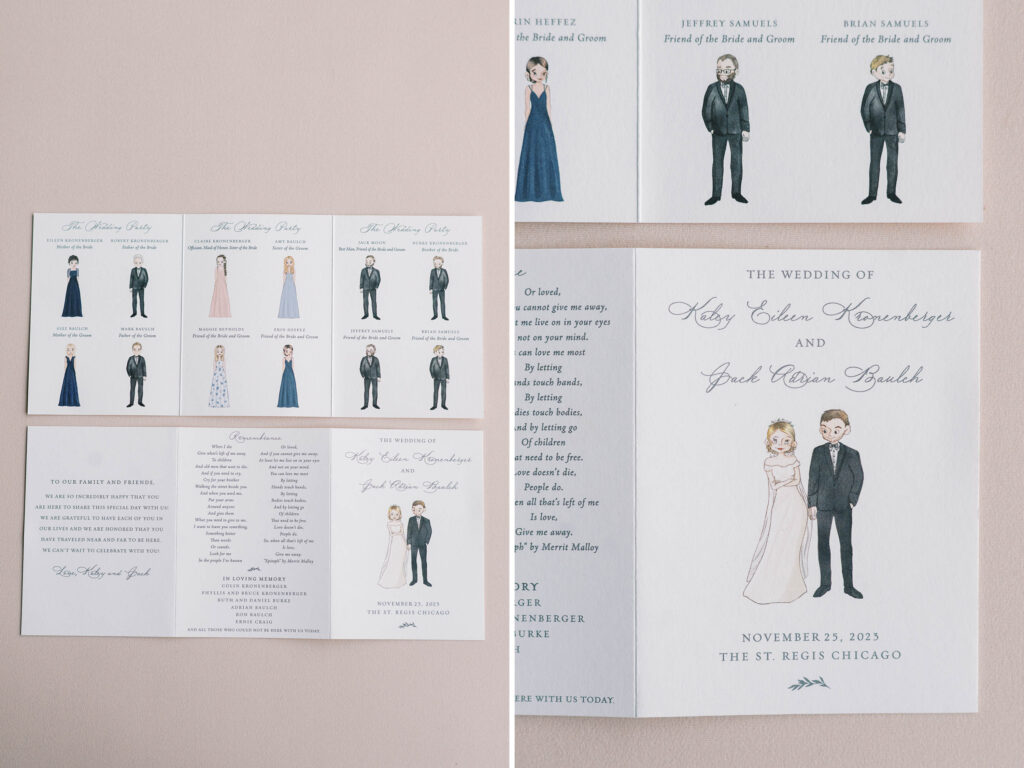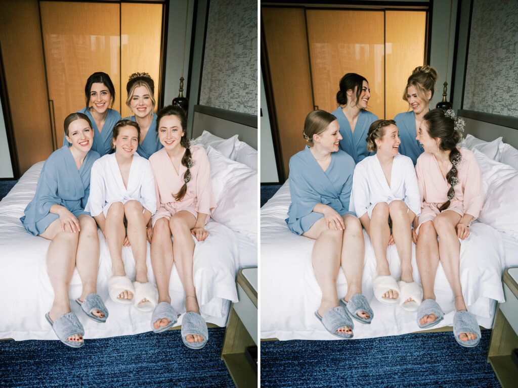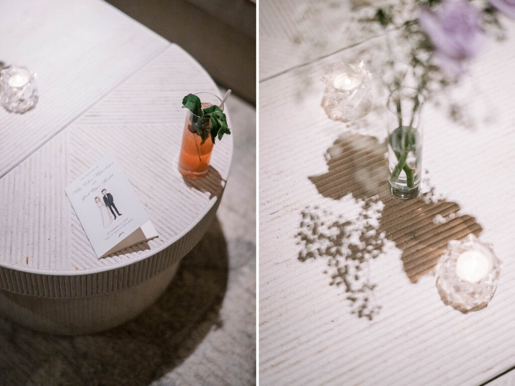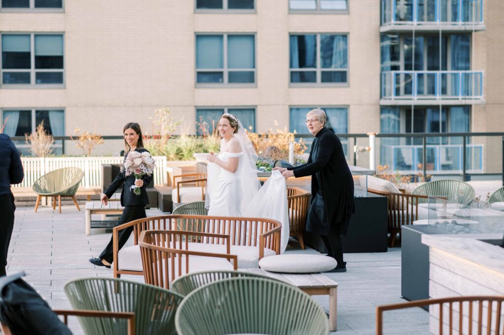 When I walked into Kaley’s bridal suite, it became clear this wasn’t just another wedding. Thoughtful details seemed to be everywhere: bridesmaid boxes filled with goodies like chic reception sneakers and cozy shawls (perfect for the rooftop chill!). Even their invitation suite showcased adorable custom illustrations of each wedding party member. It’s these tiny personal touches that guests always remember.