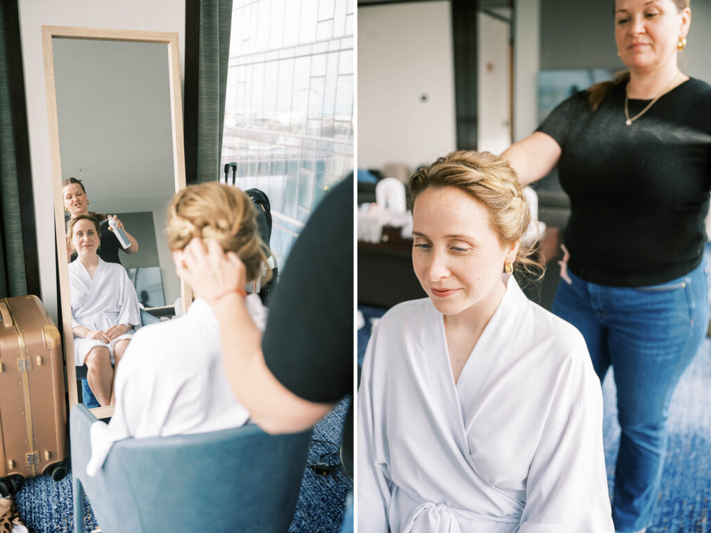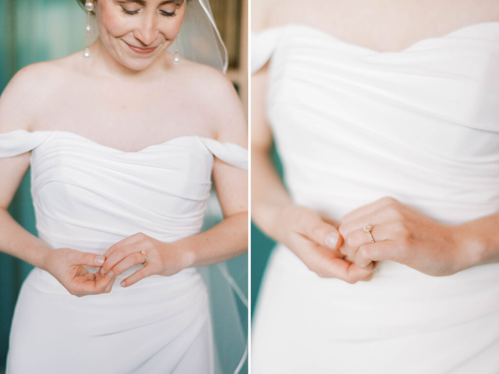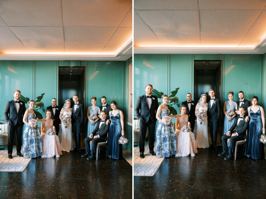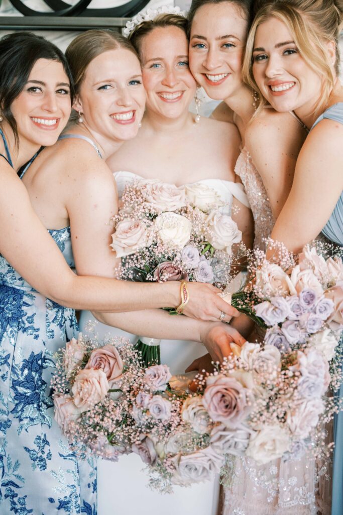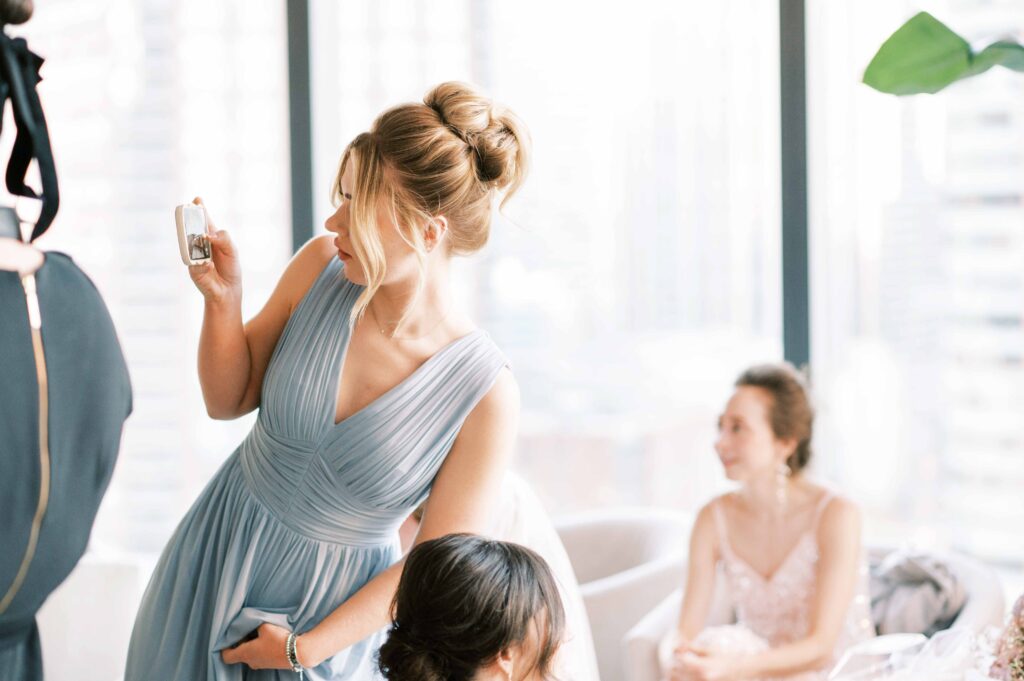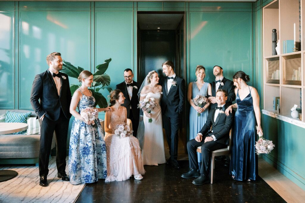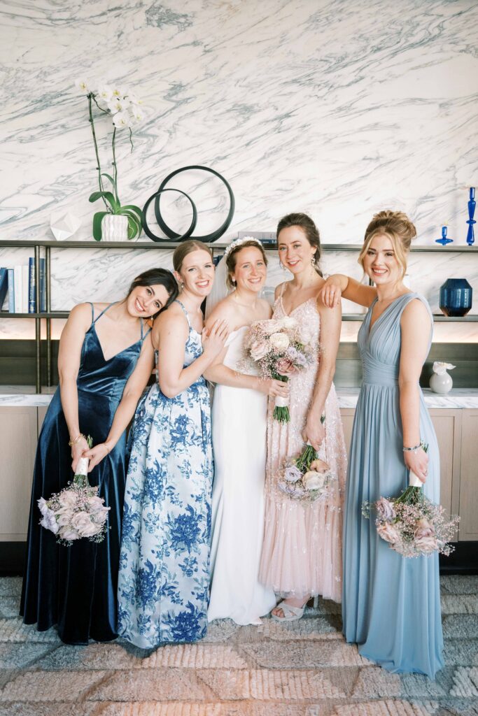 Kaley took special care to style each bridesmaid uniquely. Each of the bridesmaids wore a different dress pattern and hairstyle, mirroring their personalities beautifully. The result? Wedding party photos that felt editorial—polished yet effortlessly authentic. If you’re craving something beyond traditional matching dresses, consider personalizing bridesmaid attire. It adds depth, visual interest, and personality to your wedding images.