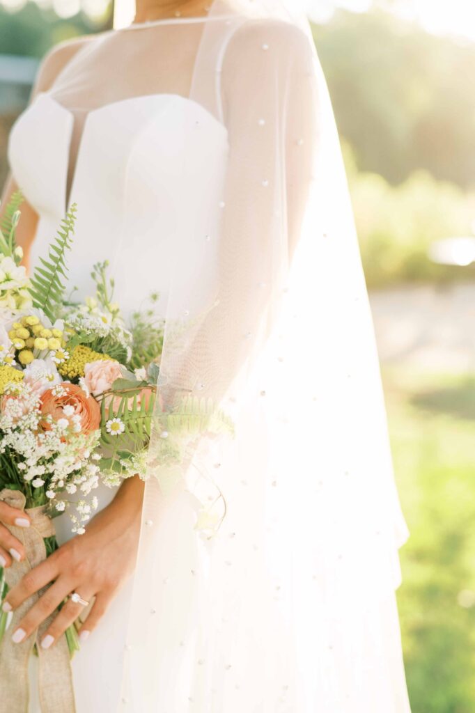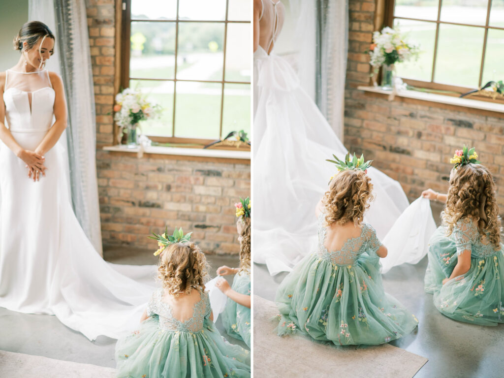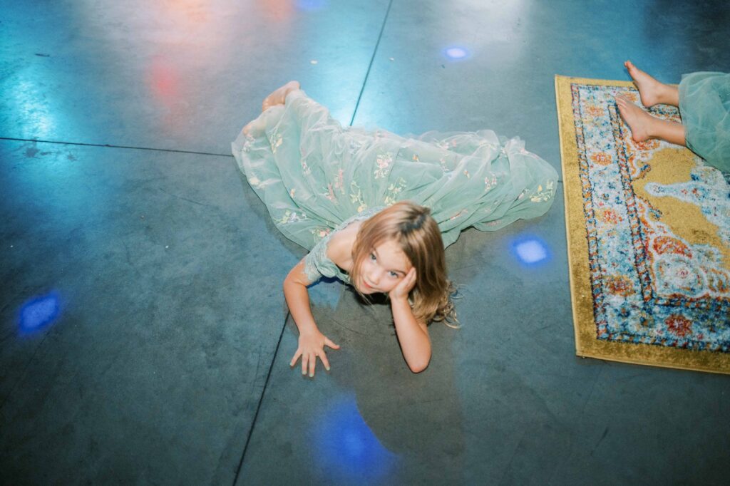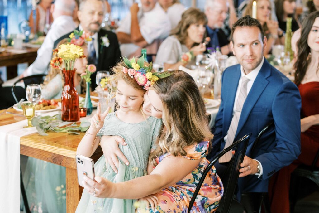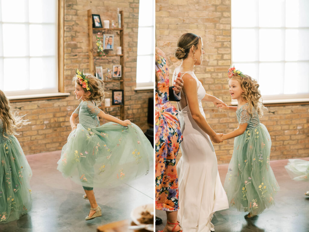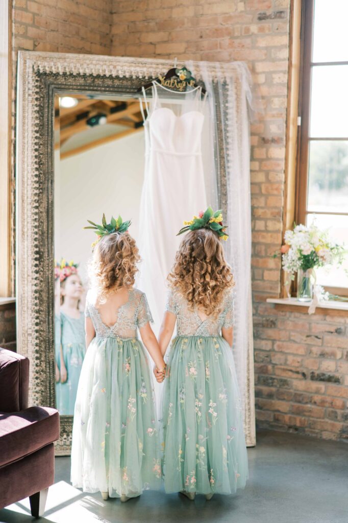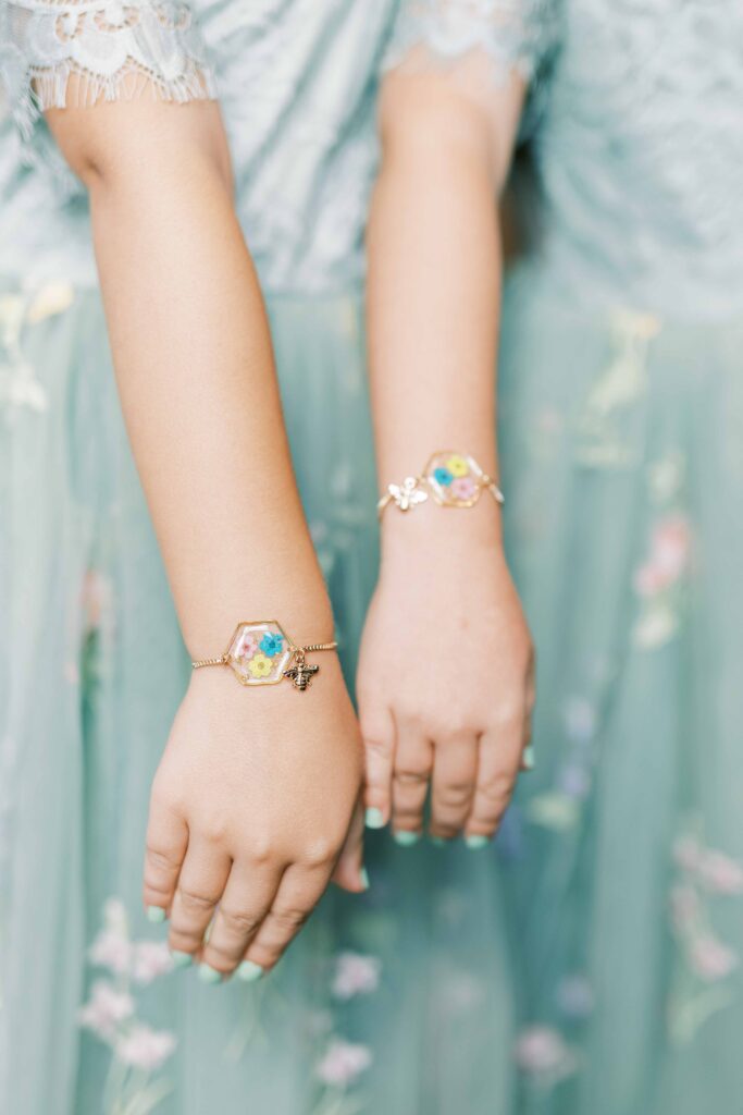 And speaking of adorable, can we pause to talk about Kat’s flower girls? They practically danced down the aisle in lace dresses embroidered with tiny petals, twirling beneath the most gorgeous flower crowns. Kat gifted each girl a sweet pressed-flower resin bracelet with a cute bee charm—something they’ll treasure forever. Seeing their beaming faces reminded me why weddings hold such tangible magic: watching love ripple through family, friends, and even the littlest hearts. (Did you catch that her grandfather handed them the rings?! Oh, my heart.)