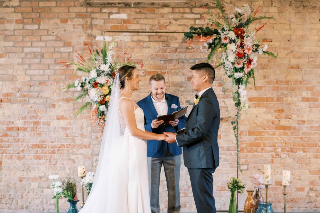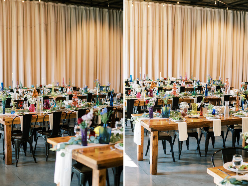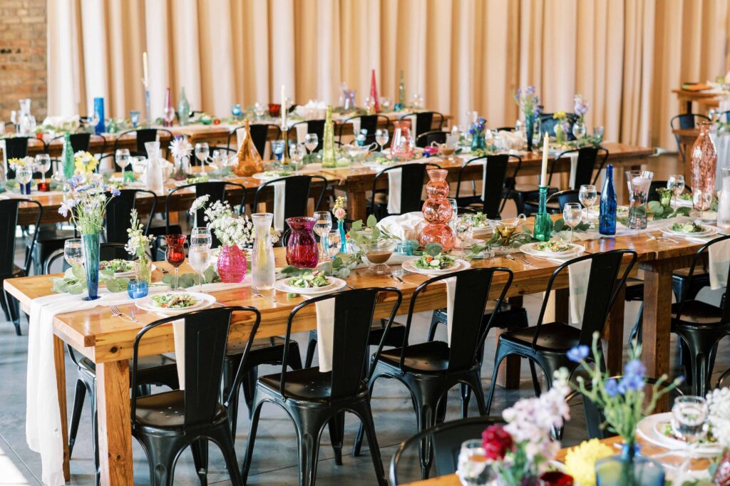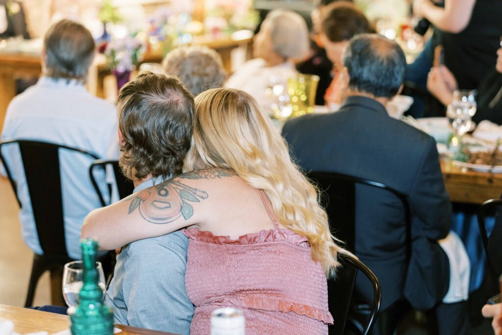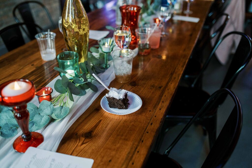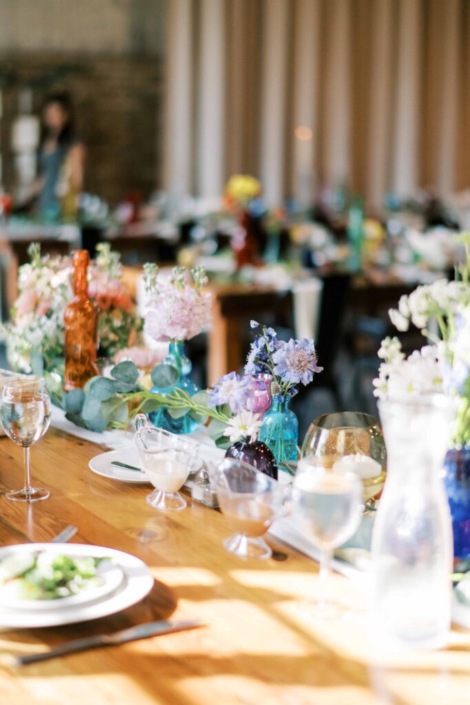 When it came to decor, Kat expertly balanced whimsy and minimalism. Single-stemmed blooms gracefully filled vintage vases, coloring each table without overwhelming the senses. The ceremony arch, elegantly understated, provided just enough structure to anchor the space, allowing everyone’s attention to rest fully on the couple themselves. Donna at Dagny and Lane Floral did a fabulous job with the arrangement, matching Kat’s vision flawlessly. Kat and Tim decided against having a traditional wedding party, and the simplicity of it felt refreshingly intimate and personal. All eyes were on them.