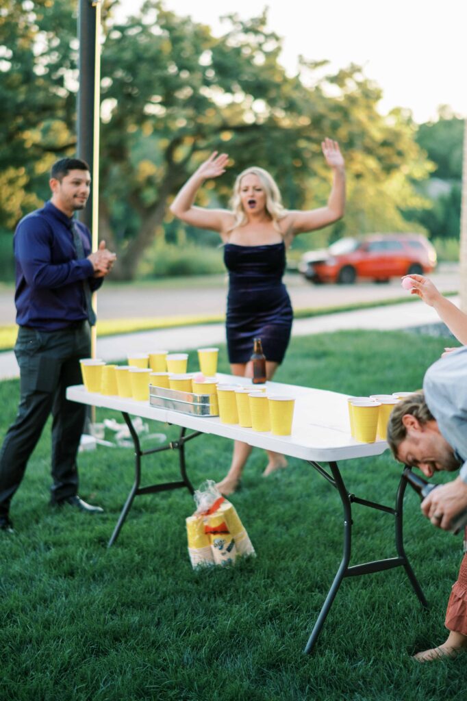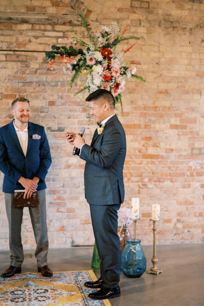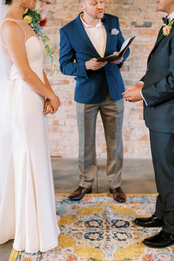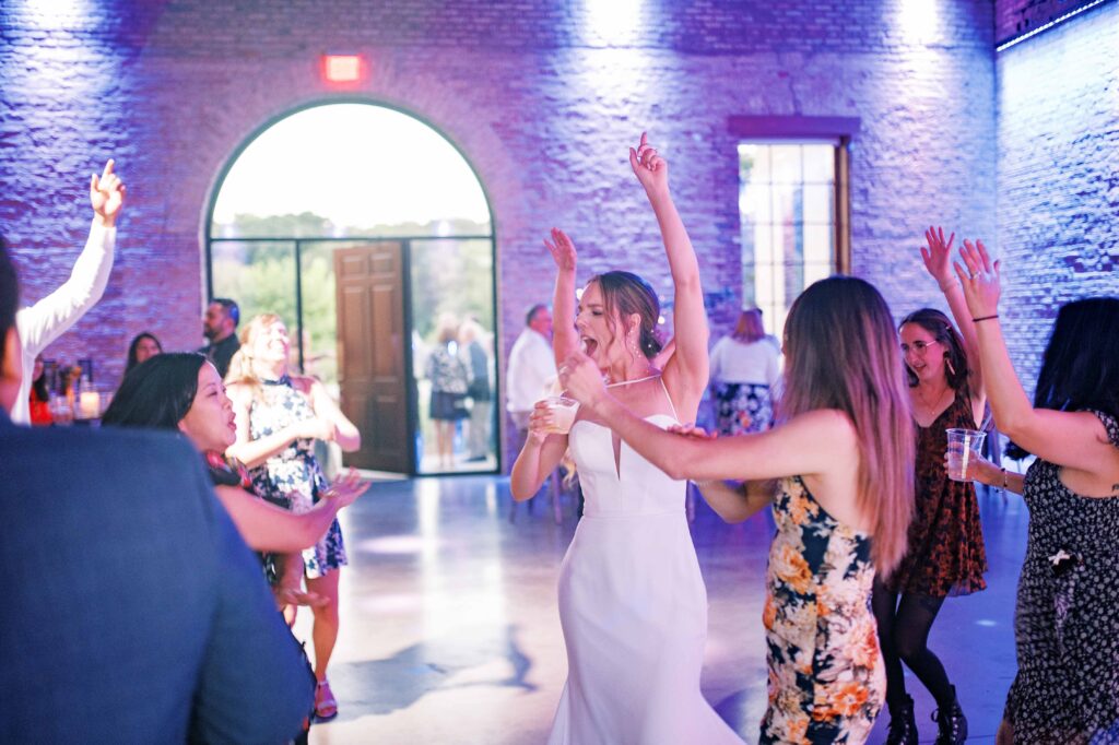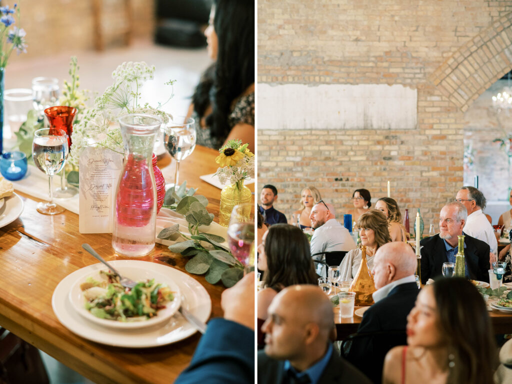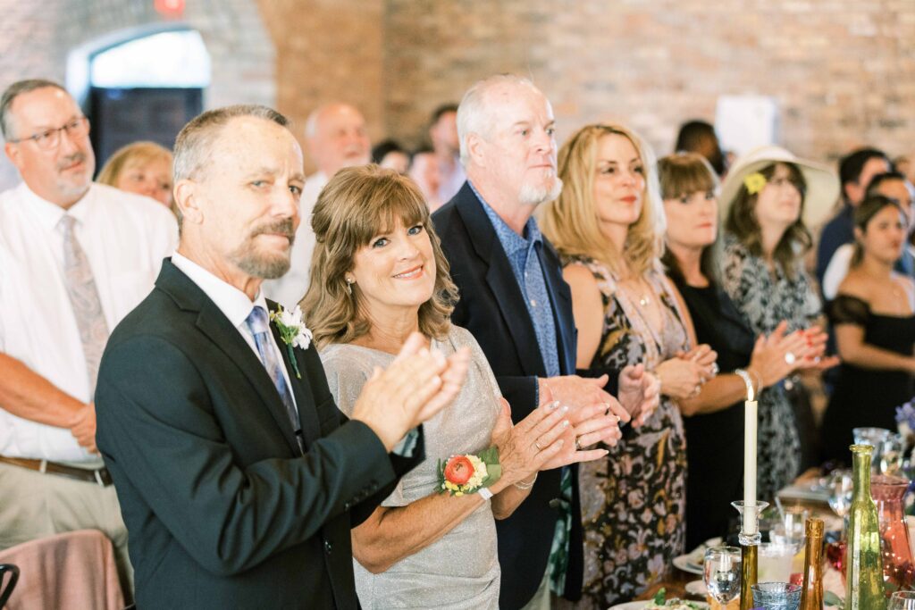 When it came to decor, Kat expertly balanced whimsy and minimalism. Single-stemmed blooms gracefully filled vintage vases, coloring each table without overwhelming the senses. The ceremony arch, elegantly understated, provided just enough structure to anchor the space, allowing everyone’s attention to rest fully on the couple themselves. Donna at Dagny and Lane Floral did a fabulous job with the arrangement, matching Kat’s vision flawlessly. Kat and Tim decided against having a traditional wedding party, and the simplicity of it felt refreshingly intimate and personal. All eyes were on them.