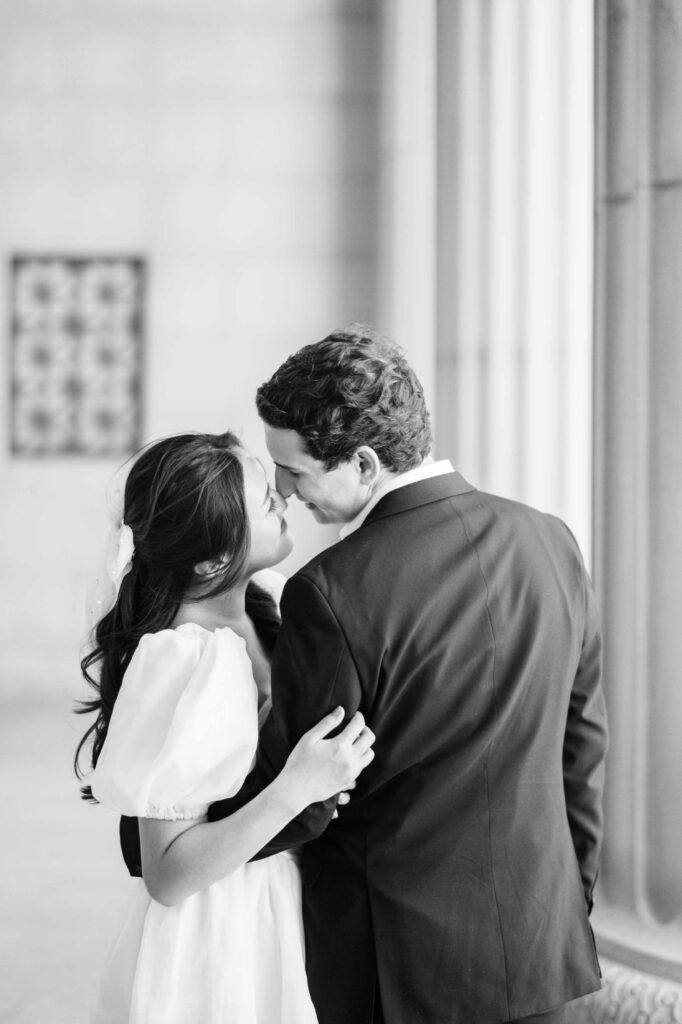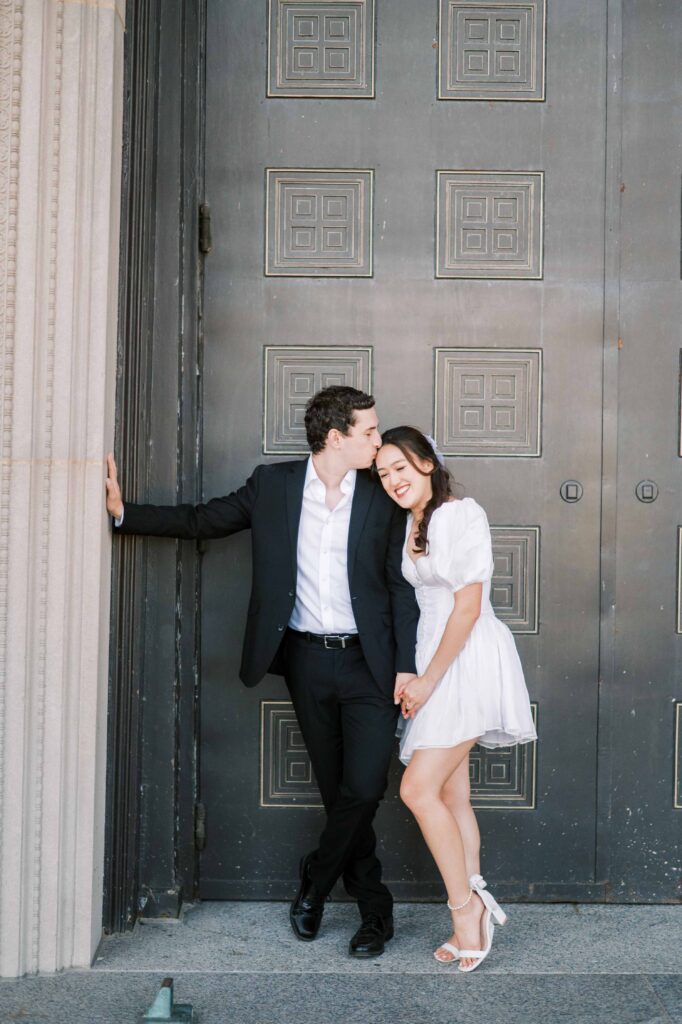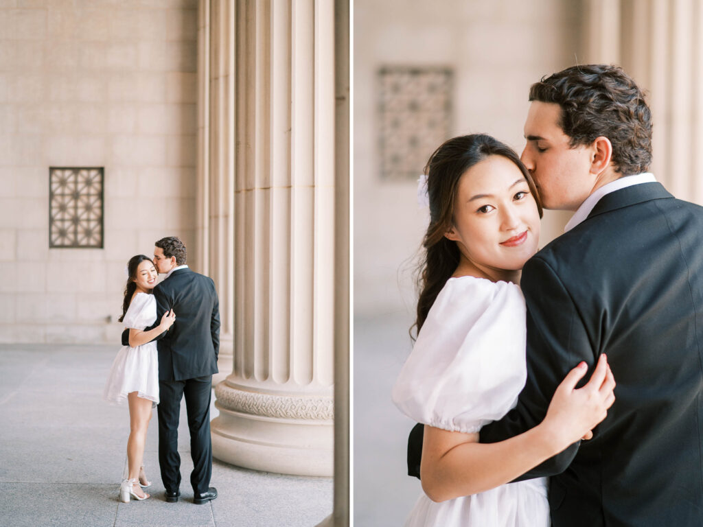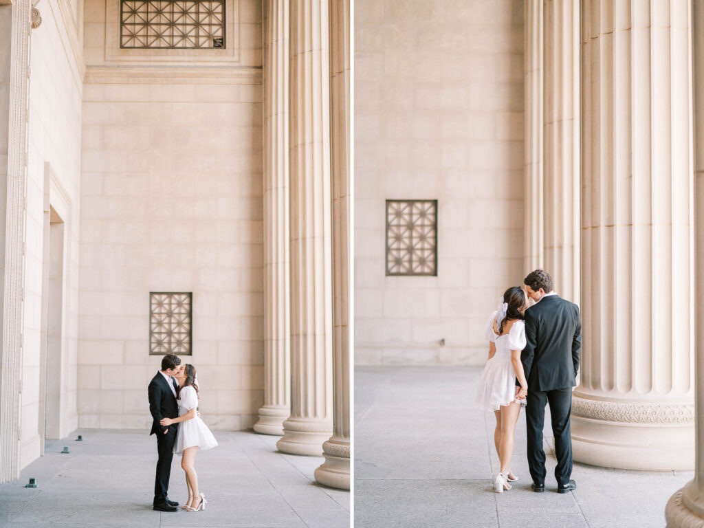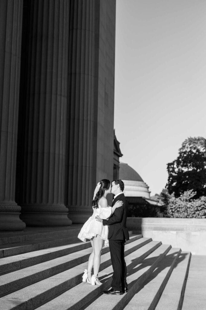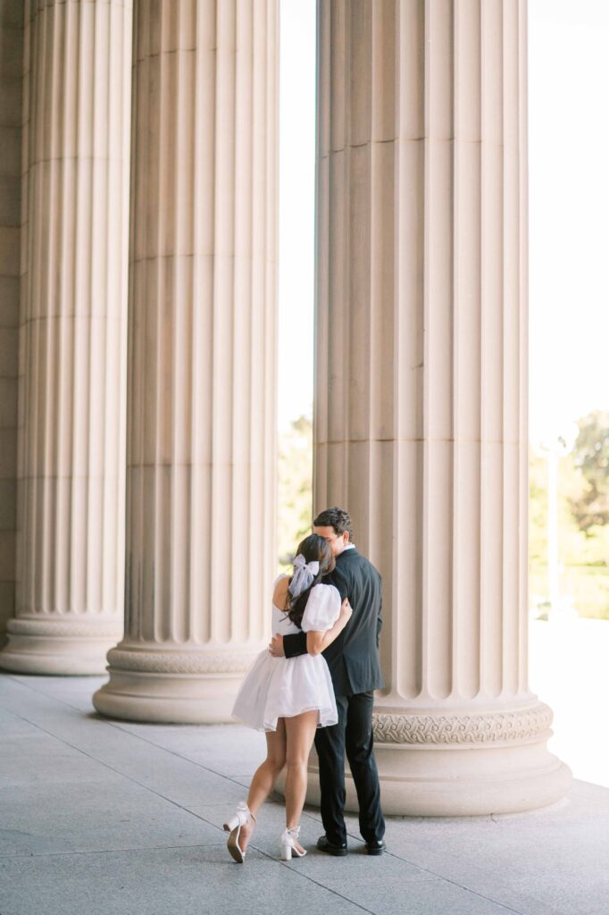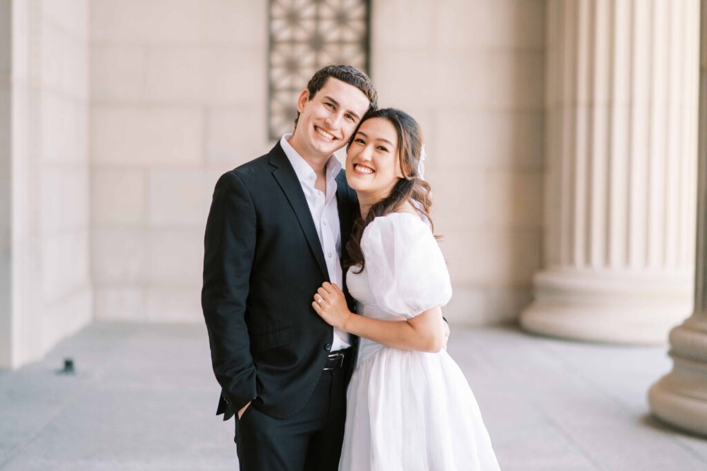 Another reason this location is a photographer’s dream is the consistently gorgeous natural light. Whether the sun is glowing softly or shining brightly, the museum grounds offer plenty of spots to soften or enhance the light naturally. We can use tall trees, archways, columns, and foliage as filters to manage strong sunlight beautifully. I love how this flexibility allows couples to relax and enjoy themselves, knowing the photos will turn out beautifully no matter the weather.
