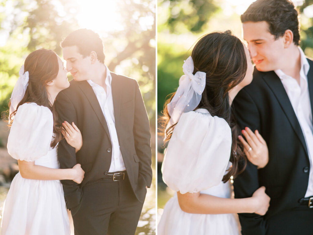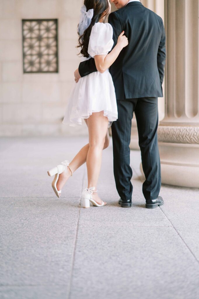 Kristina first wore a chic white A-line mini dress with puff sleeves, while Matt complemented her beautifully in a sharp black suit (sans tie, which added an easygoing touch). Their outfits created a sophisticated and timeless look that meshed seamlessly with the classic architecture and formal gardens.