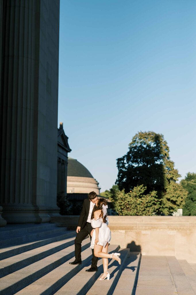 My goal with each blog post is to help future couples visualize possibilities for their own photographs. Kristina and Matt’s session perfectly captures this vision. Their photos illustrate that you don’t have to travel to multiple locations or endure lengthy commutes to achieve variety. A well-chosen spot like the Museum of Science & Industry grounds provides all the inspiration you need, beautifully packaged into one location.