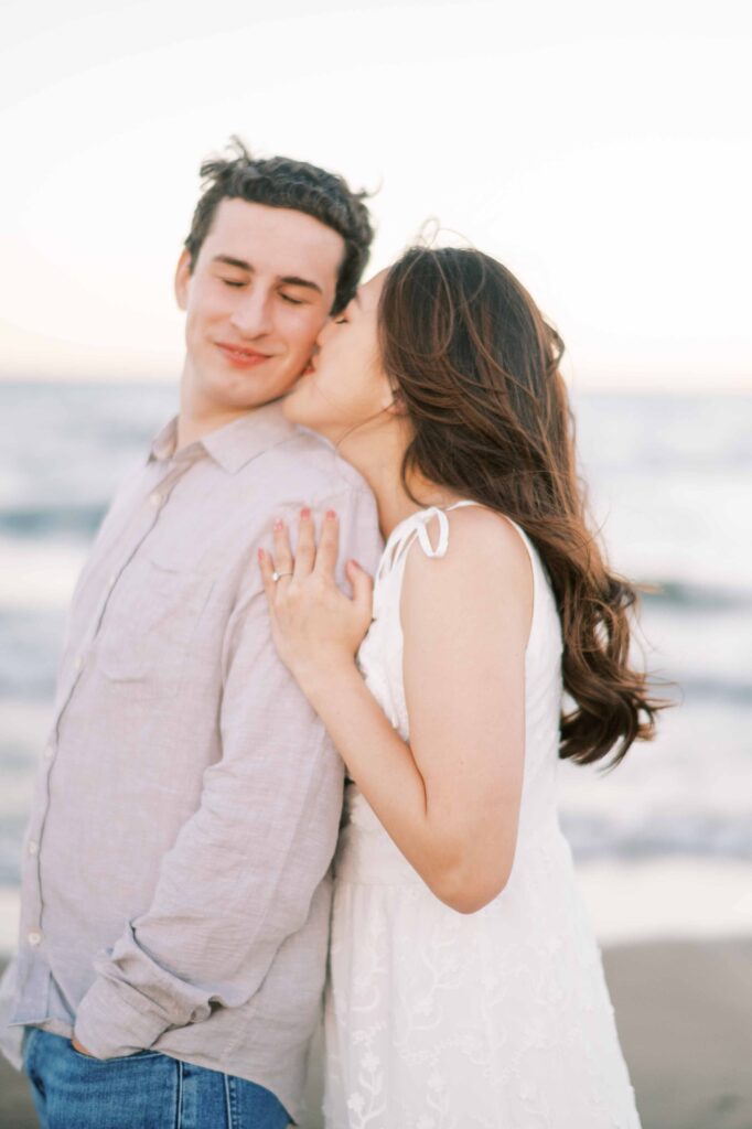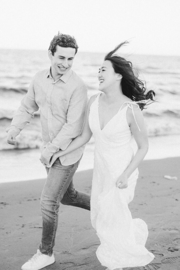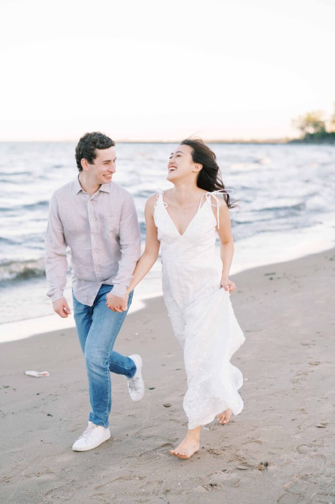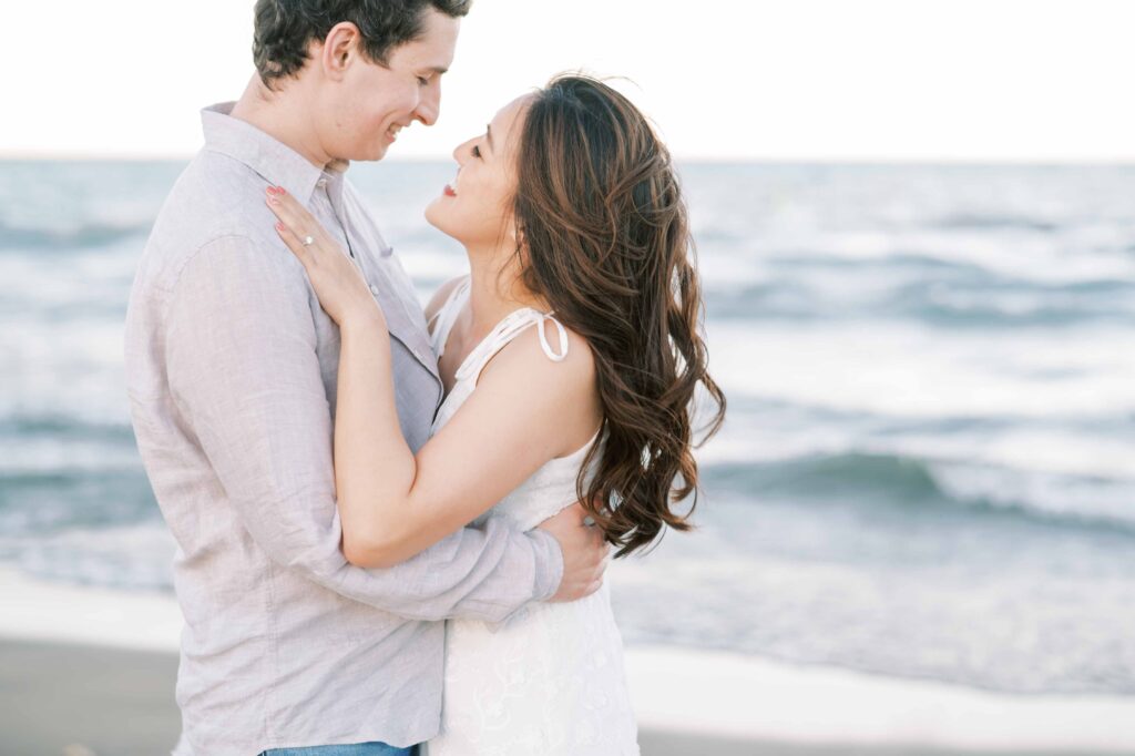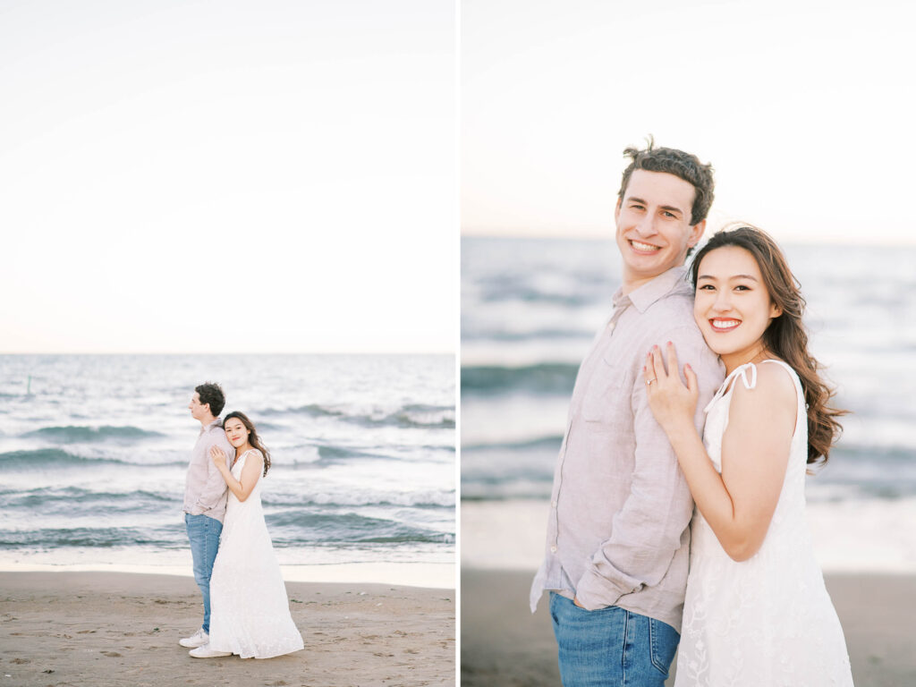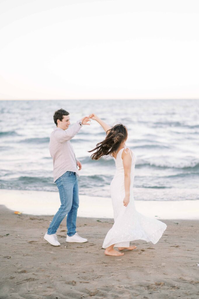 For our later shots along the nearby beach, Kristina switched into a flowing white maxi dress that caught the breeze just right. Matt traded his suit for more casual attire: a tailored button-down, jeans, and sneakers. Their outfits and ease with each other highlighted their personalities—warm, stylish, and comfortable in their own skin.