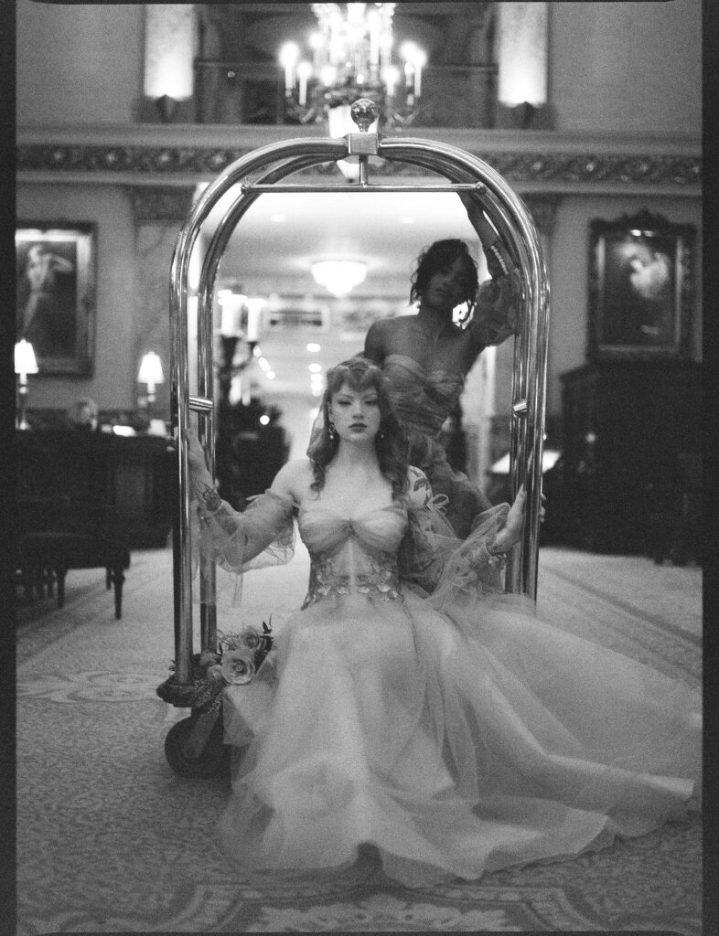 Our first muse wore a corseted Mignonette gown that slipped gently off the shoulder in carefree elegance. A modern-day Holly Golightly with a touch of defiance, she embodied the anti-bride: elegant yet untamed. My lens loved her quiet confidence and pensive poise. These compositions remind us that beauty can be soft and unstructured and that grace lives in the in-between moments.