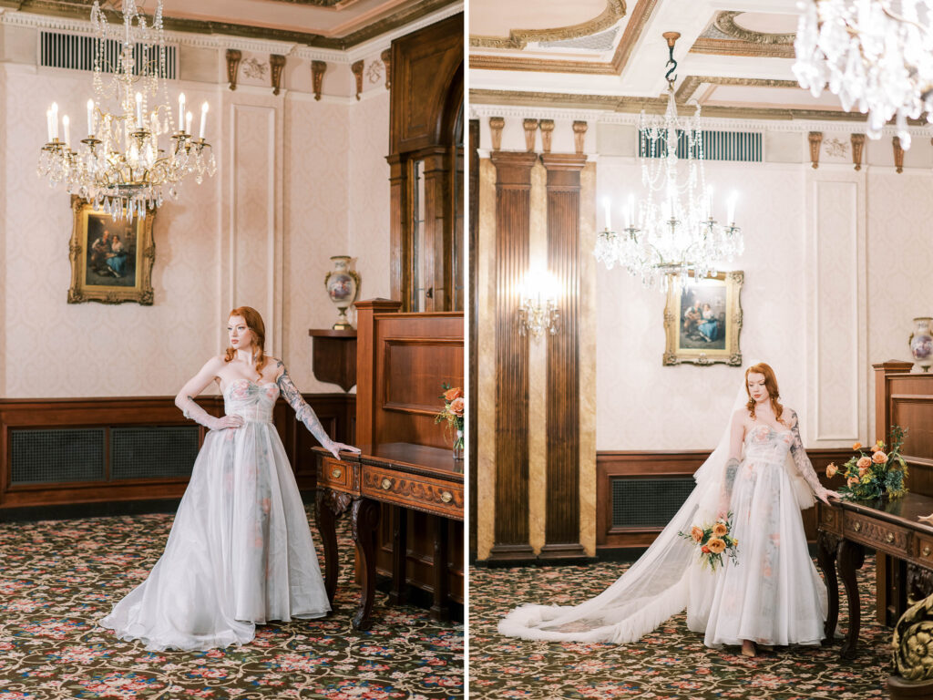 In one of The Pfister’s most ornate rooms, we painted a contrast between past and present. Our bride—tattooed, sleeveless, ethereal—stood tall in a gown that might have once graced a 19th-century ballroom. Her presence felt like a bridge between centuries: old-world opulence meeting modern fashion. It was all candlelight and carved wood, the kind of setting where stories (and secrets) live forever.